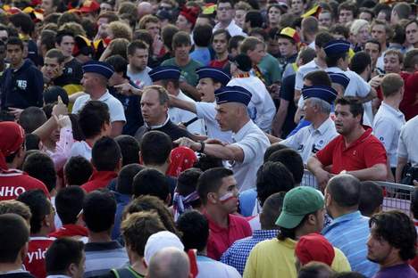 De voetbalsupporters, nou ja dat zijn geen supporters meer, in Gent gisteren gezien, triest he, dat zoiets blijkbaar nodig is.