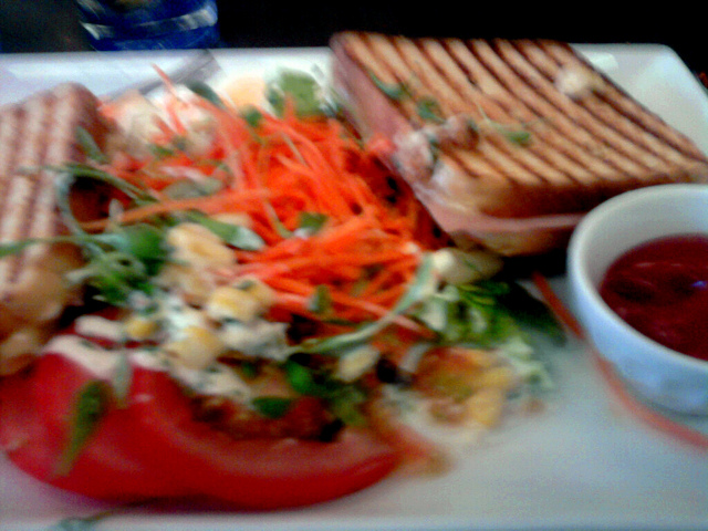 Ik meen een Croque te herkennen, en op de voorgrond iets wat in de verte doet denken aan een gevulde tomaat, of paprika. Het is in ieder geval rood. Denk ik.