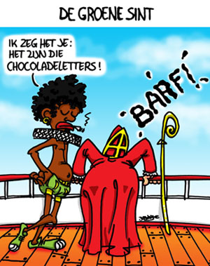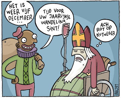 De Kerstman, die andere pretbederver, heeft al klacht ingediend tegen die louche praktijken en eist een schadevergoeding voor al de verloren gelopen werkuren, nadat Al-Sinterkaeda hem in elkaar heeft geslagen omdat hij die drugsdeal niet wou sluiten met de kleuterschool “Sinterklaas Kapoentje” net over de Zeeuwse grens in het Belgische Wachtebeke.
