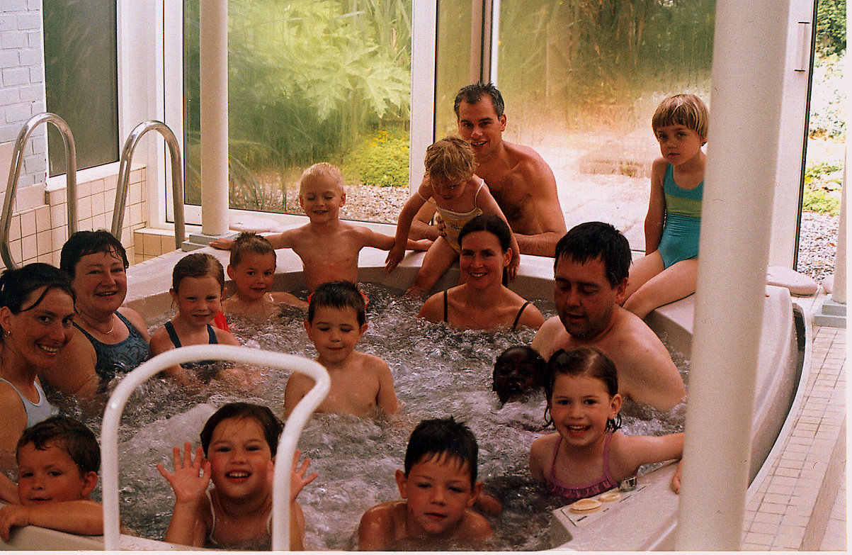 Je zit rechts tussen de bubbels en Eva zit in het blauwe badpak achter je.