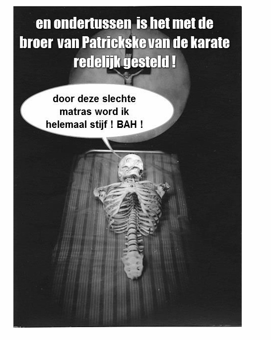 Gelukkig was het maar een vleeswonde, maar door al dat bloed dacht dikke Bertha van het Rode Kruis dat het veel erger gesteld was en sprong met haar volle gewicht op de broer van Patrickske van de Karate om mond aan mond beademing toe te passen en dit werd de broer van Patrickske van de Karate fataal.