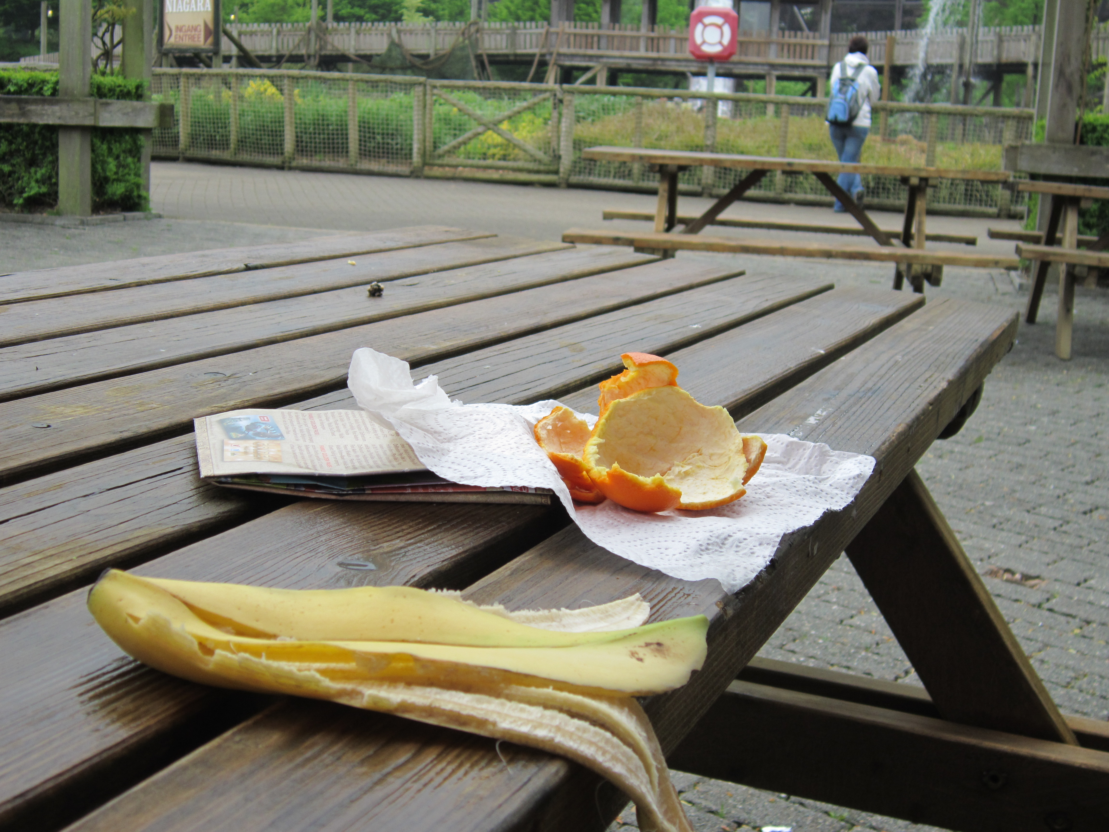 In een pretpark is het met slecht weer in ieder geval minder druk; en dat is mooi meegenomen ! Jullie hebben de banaan en sinaasappelschillen ná het maken van de foto natuurlijk keurig in de afvalbakken gedaan hé 😉