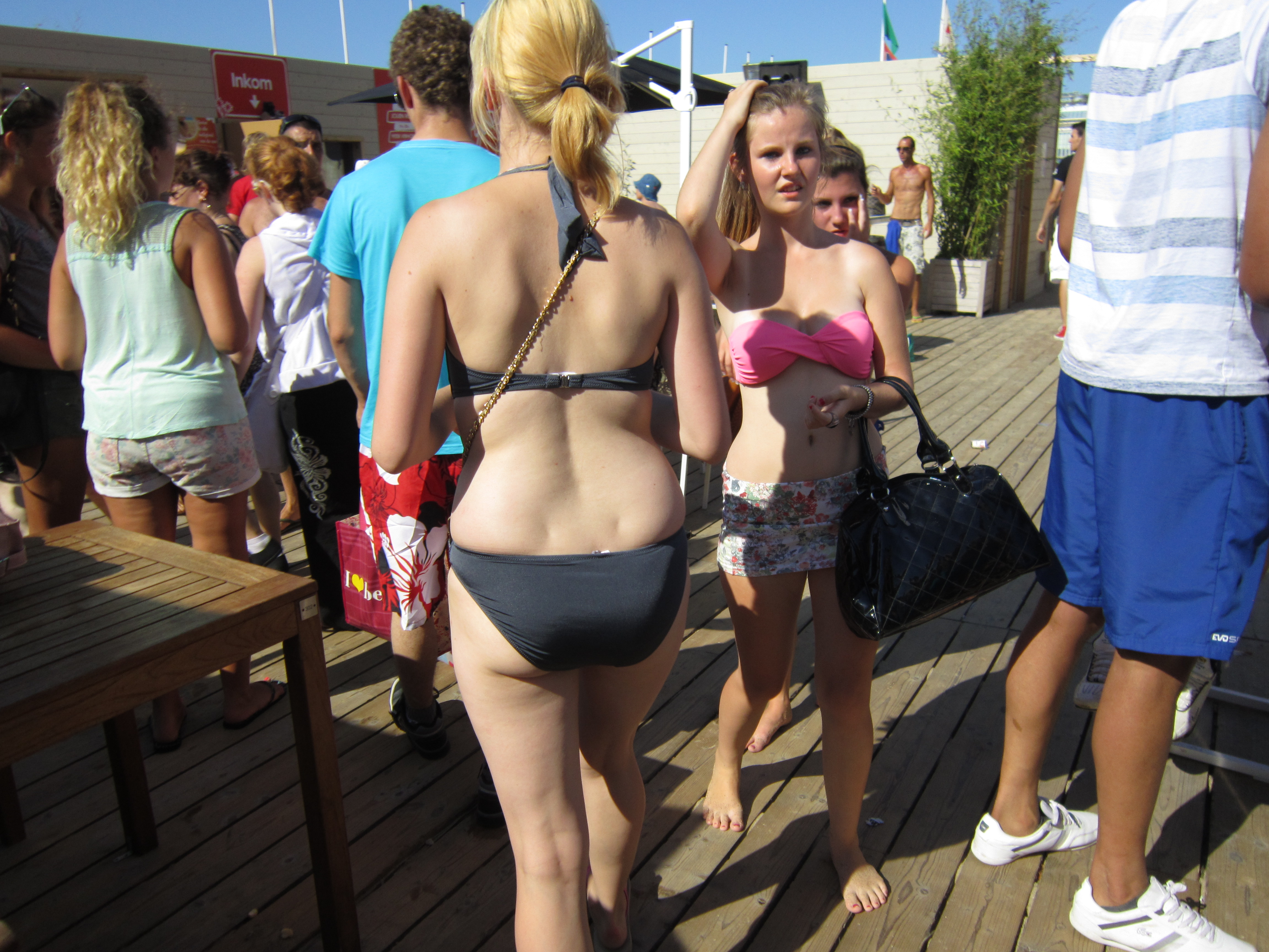 Iemand zou het meisje met haar donkere bikinibroekje erop moeten attenderen dat haar wasvoorschriftetiket boven haar bikinibroekje uitsteekt … en het eventueel terugduwen …