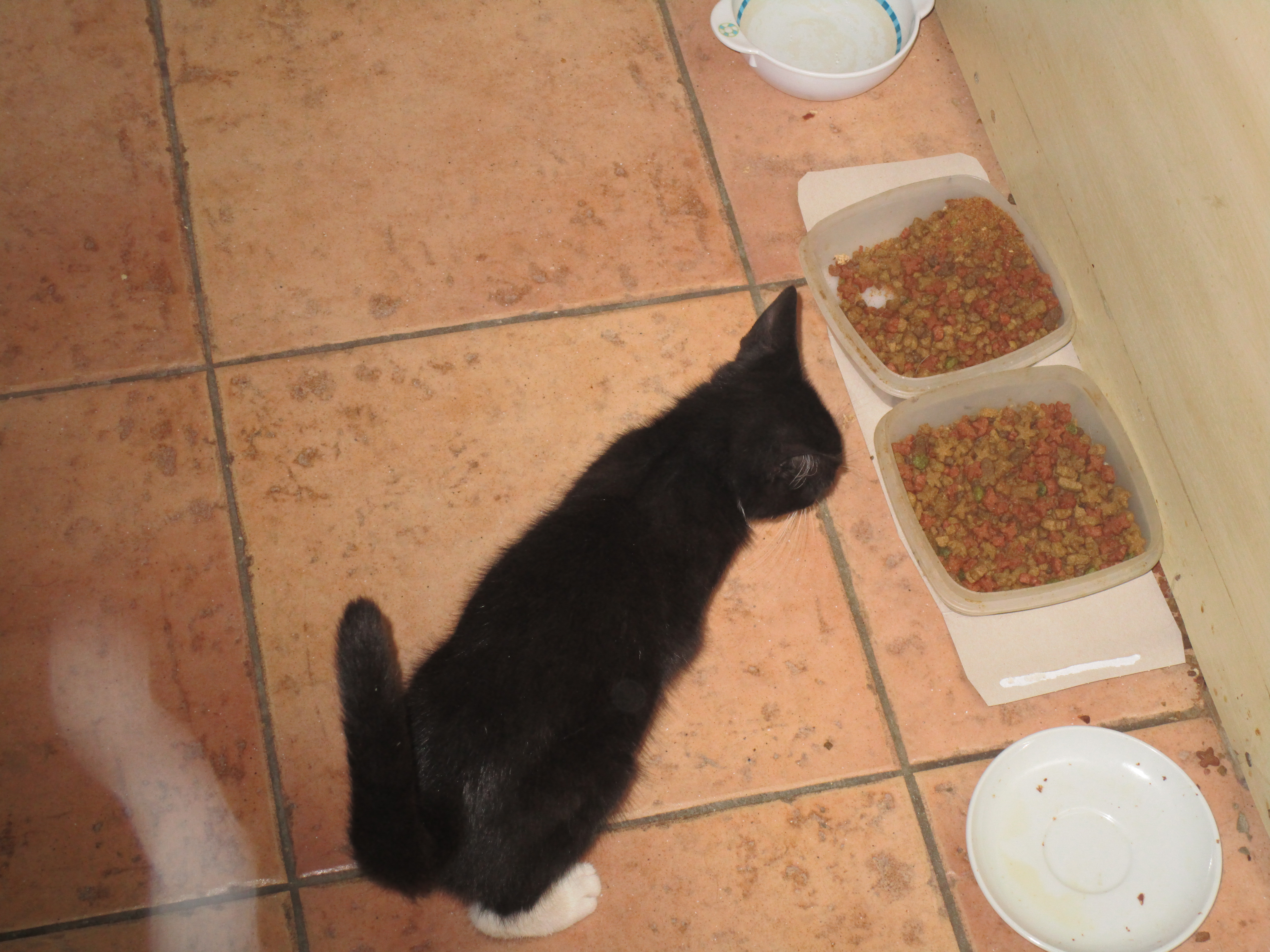 Nu komt hij ook met de andere katten ,ee naar binnen en eet een hapje lee.