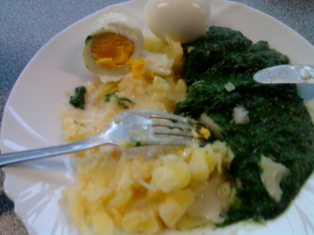 Aardappelen met spinazie en een hardgekookt ei eten we hier regelmatig ook, maar papssaus noemen we het niet.