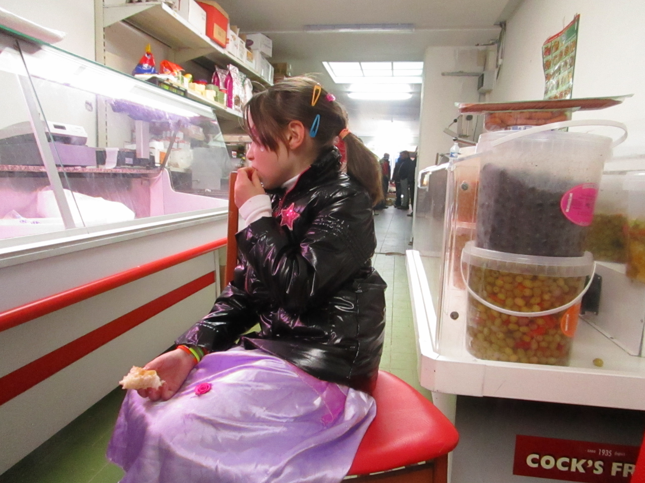 Terwijl we winkelden mochten we proeven van een lekker klaargemaakte kip met brood erbij.