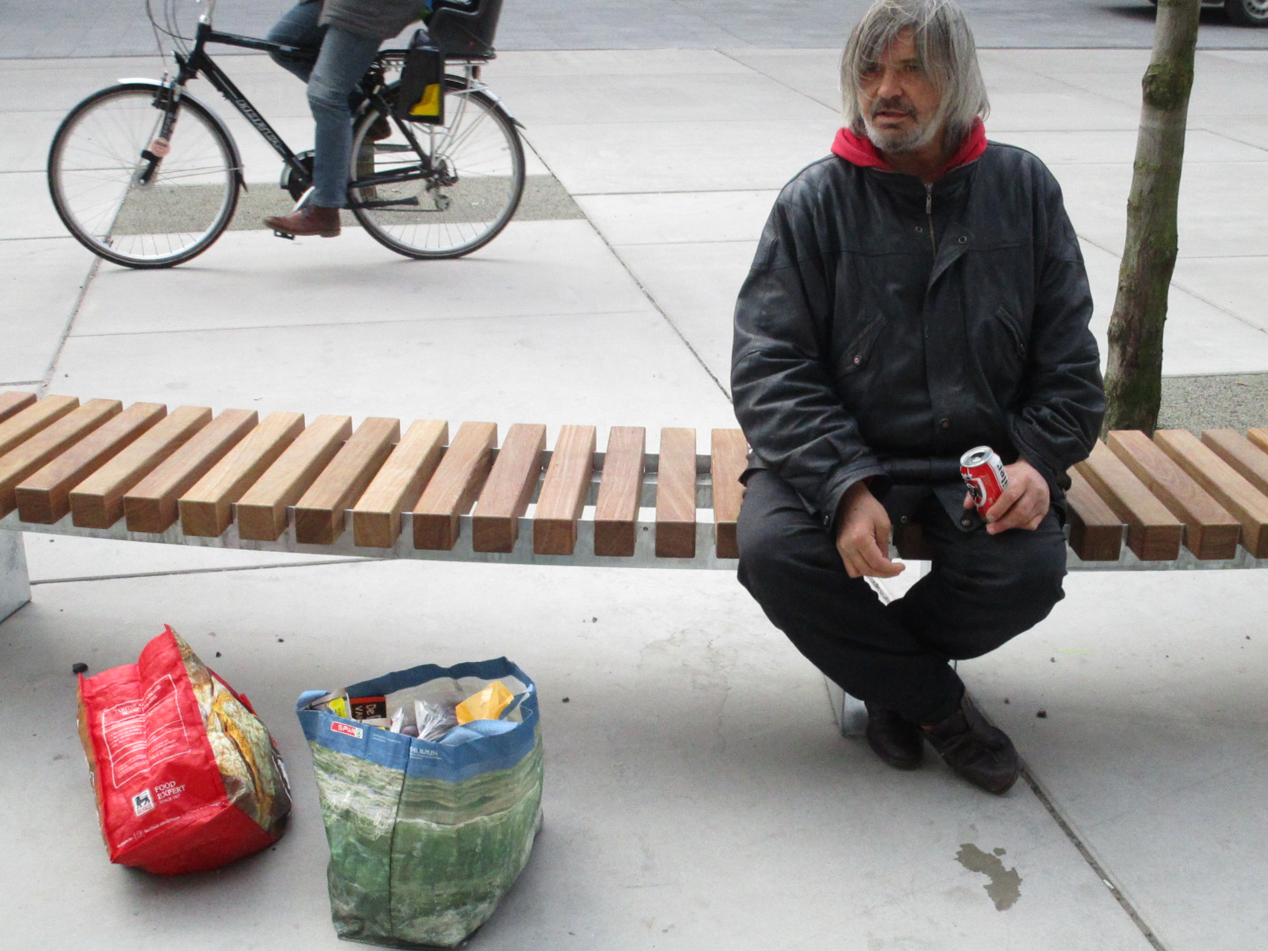 Dit soort figuren kom je in onze Nederlandse hoofdstad veelvuldig tegen. Versukkeld, verwezen, door de maatschappij gedumpt en vermoedelijk niet meer in staat een normaal leven te leiden. Drank, drugs en ander genot heeft ze doen verloederen. Ooit woonde in een heel chique park in het rijke Amsterdam-Zuid een soortgelijke vogel in een soort boomhut. Deed niemand kwaad, schooide wel de straten af voor allerlei zaken die hij als nuttig of eetbaar beschouwde. Dat werd hem uiteindelijk ‘noodlottig’. Men pakte hem op en hij werd uit het parkje verbannen. De hut bleef nog lang intact, maar is nu door storm en regen vernield….