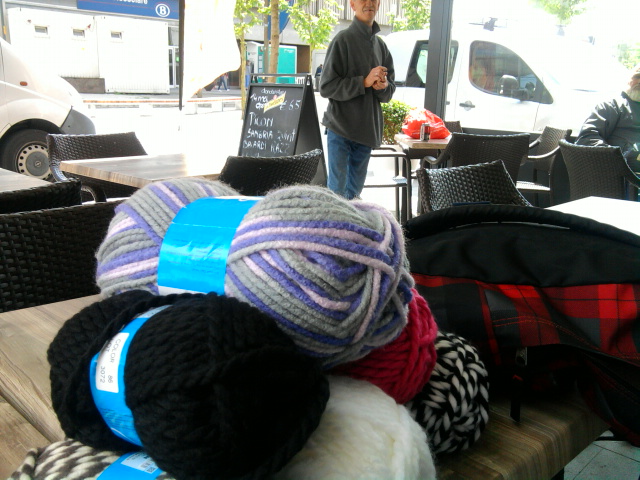 Deze foto nam ik met mijn GSM vrijdagmiddag toen ik samen met Eva pauze nam en we iets gingen eten bij de frituur naast het werk. Ze toonde me wat ze zoal gekocht had in de Action. Ze heeft zich voorgenomen een trui voor me te breien. Ik ben benieuwd. 🙂