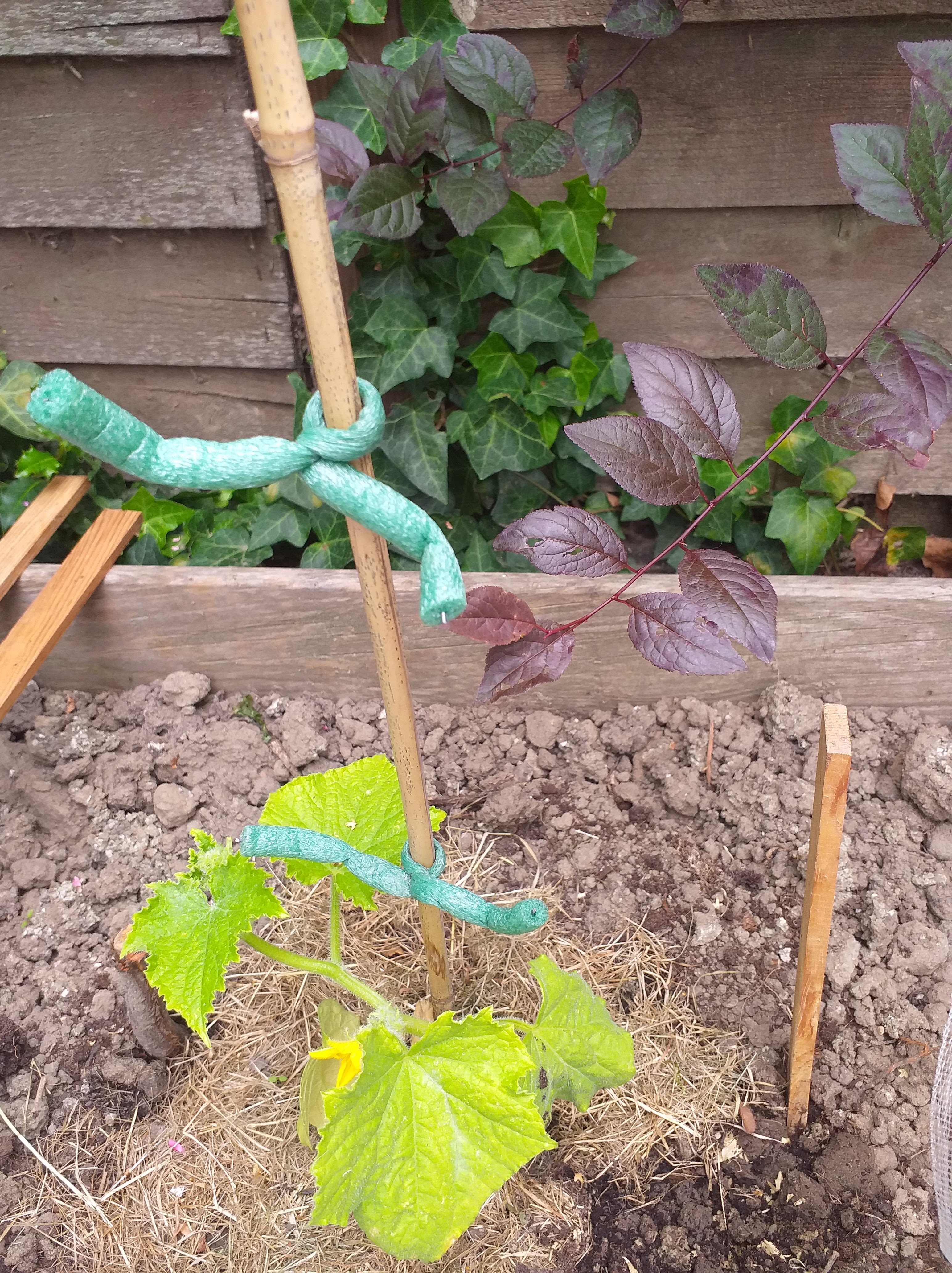 Of de komkommerplant nog aanslaat? Hij heeft in ieder geval een handvat. 😀
