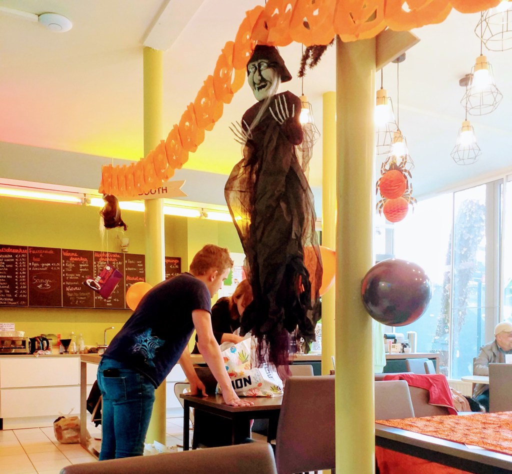 Donderdagnamiddag was Eva druk bezig om de “Opstap” te versieren in functie van het komende Halloween. Ze mocht zich uitleven in de zaal. Spoken en geesten genoeg om de kleintjes bang te maken. 🙂