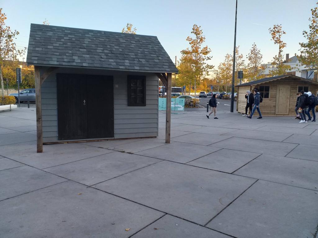 Na een vrije dag ben ik vandaag weer op het stationsplein verschenen. Niet dat dit zo belangrijk is voor de wereldpers. Wat me opviel was onder andere dit huisje of hutje en materiaal dat nog in zijn/haar verpakking stond te wachten.
