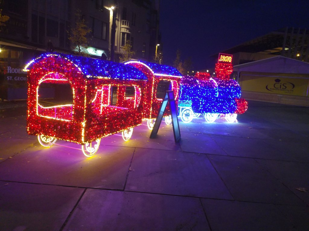 Toen ik dinsdagmorgen het stationsplein opreed met de fiets kwam ik deze trein tegen. Nu zijn treinen in de buurt van het stationsplein geen uitzonderingen, maar deze was nieuw voor mij. Op het stationsplein was men bezig de hutjes die vroegern op de Grote Markt stonden in de kerstsfeer te brengen met de nodige attributen.