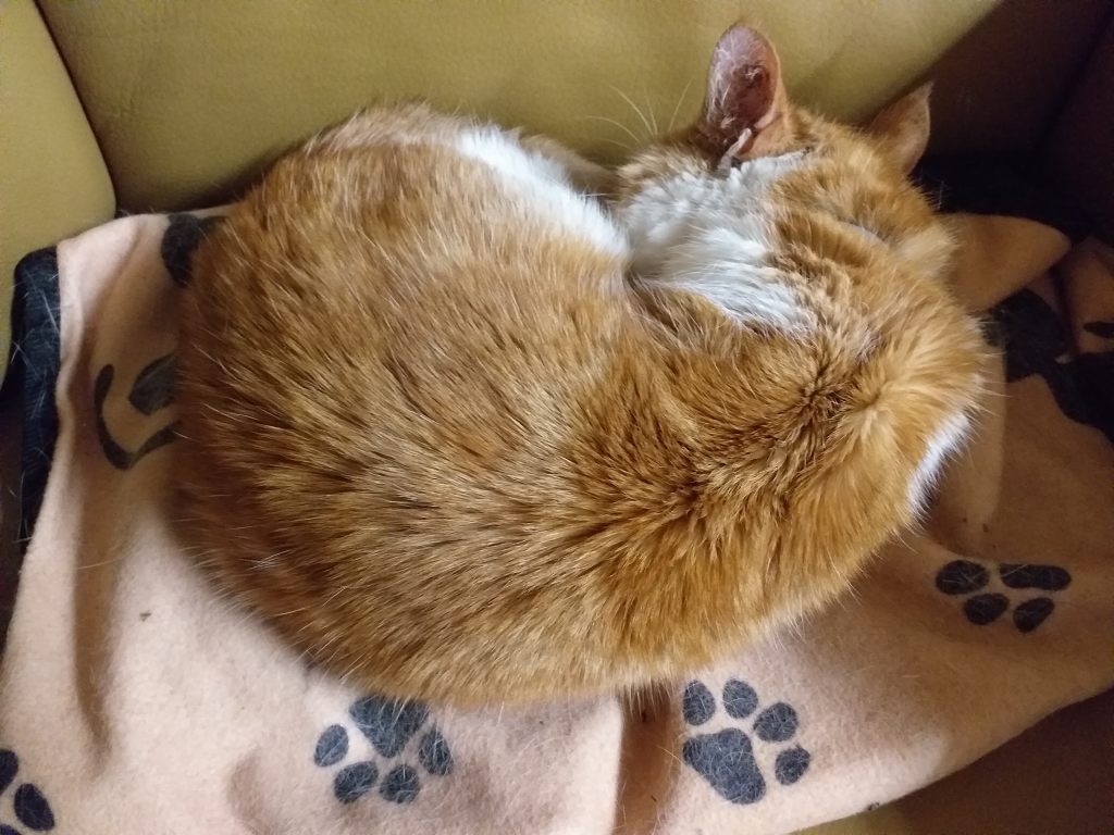Verder is hier alles rustig zoals je op de foto hierboven kan zien. Ginger ligt de hele dag te slapen. Nu en dan wakker voor de maag en om de kattenbak te bezoeken. Meer komt er niet meer uit. Hij is nu eenmaal een dagje ouder.