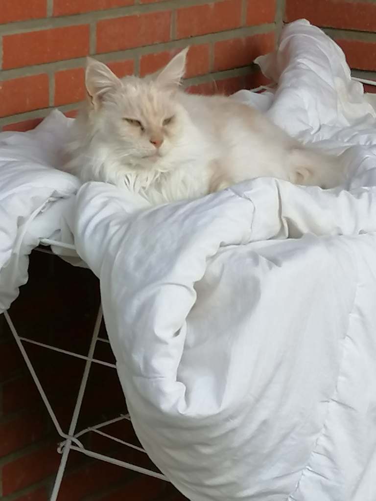 Prachtige poes en foto! Heel verstandig om op het dekbed te gaan liggen. Lekker zacht aan het kontje.