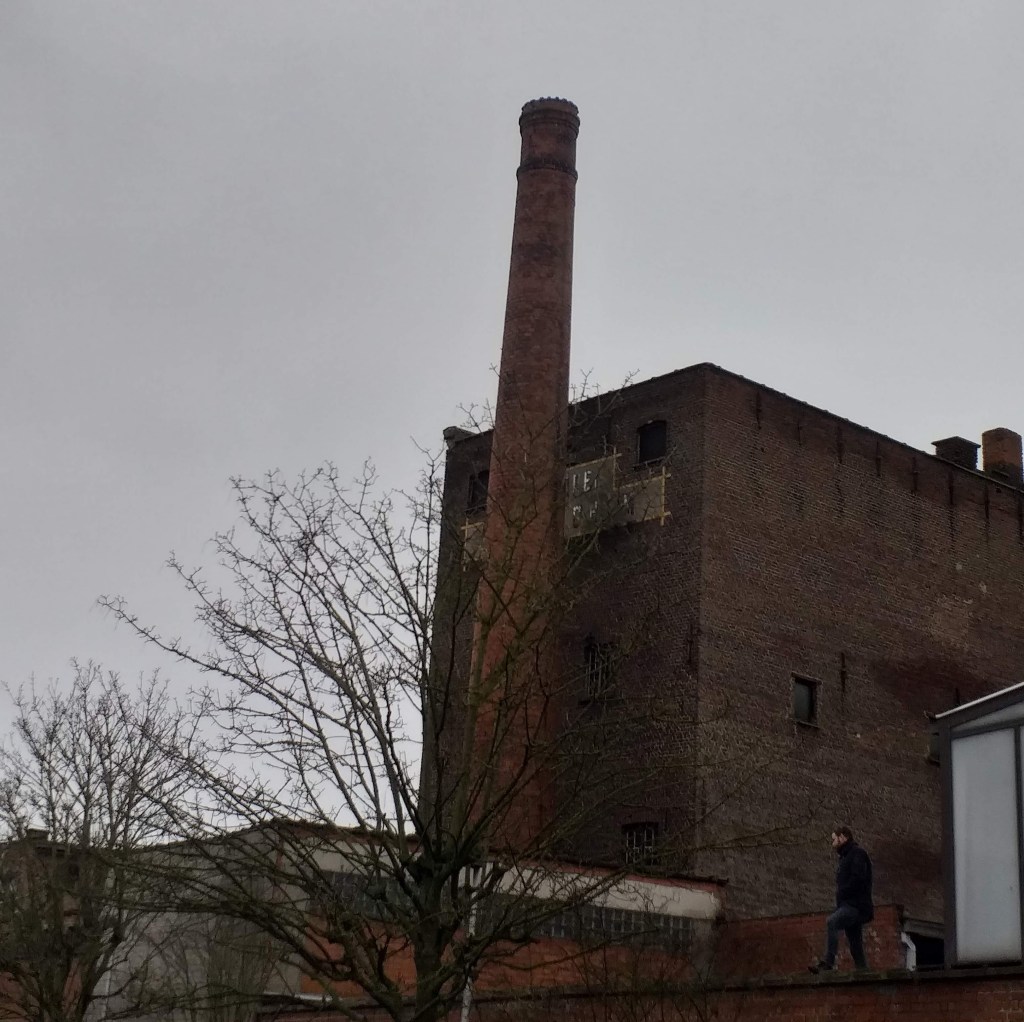 Dat de schoorsteen op instorten staat is gezichtsbedrog. Ik zal mijn GSM niet mooi recht genoeg gehouden hebben. 🙂 Die man op de foto onderaan was dus niet in gevaar. Geen idee wat die daar deed. Het zijn toch mijn zaken niet.