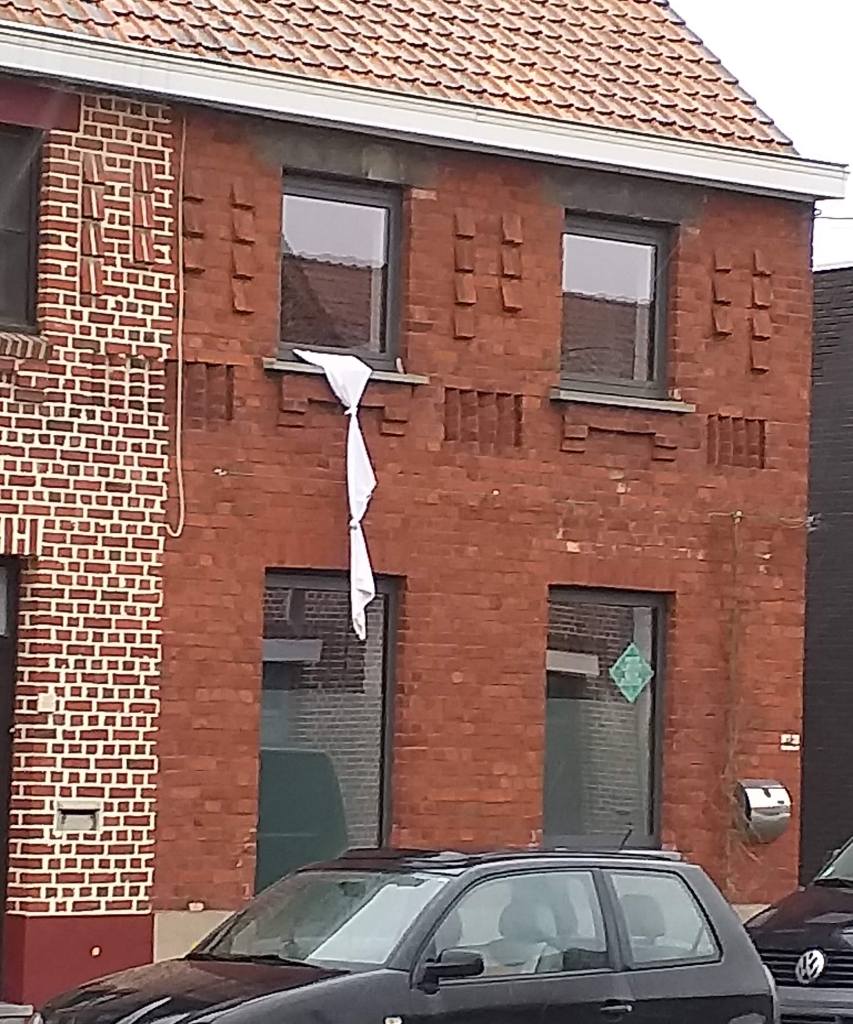 Het is niet duidelijk of het laken op de onderste foto voor dit initiatief buitengehangen werd. Best mogelijk dat een echtelijke ruzie of een lastige tiener hiervoor verantwoordelijk is.