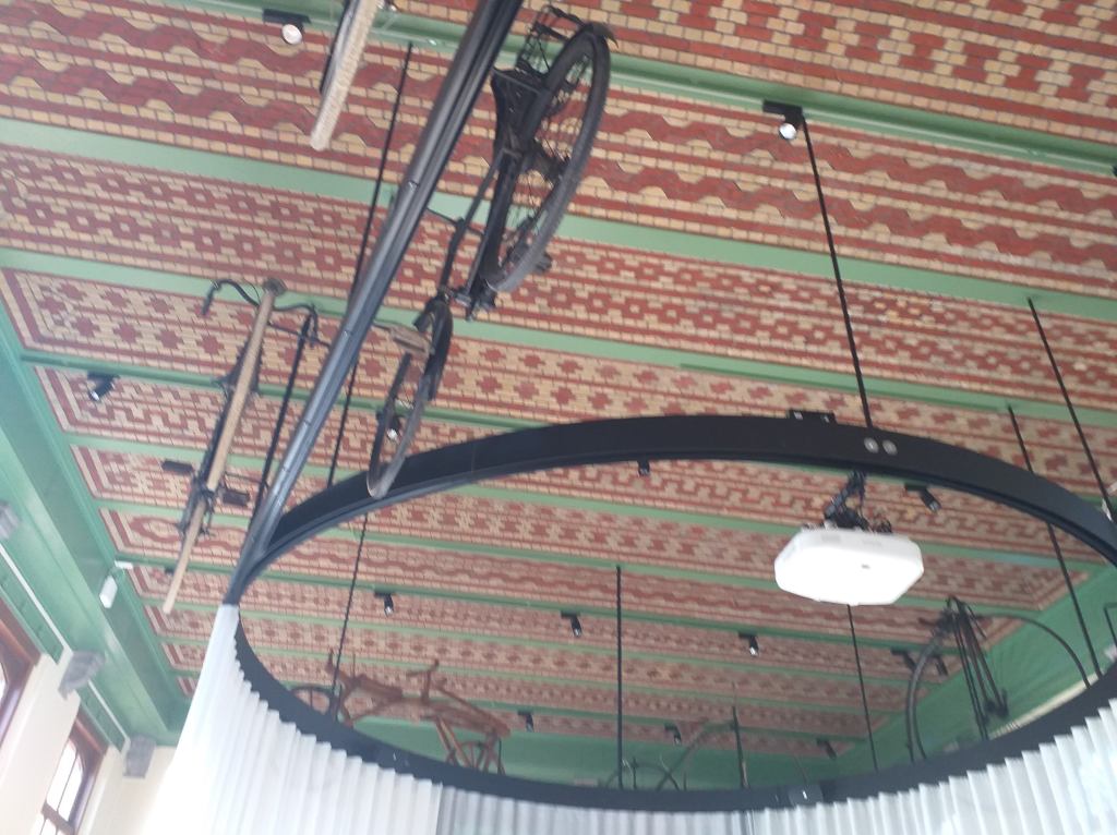 Mooi te zien aan de plafon. Wielermuseum is dit. Ik vind heel apart gezicht. Zou ik nooit aan de plafon hangen. Wel apart. Stoffen moet maar lange stok van gebruiken. haha…
