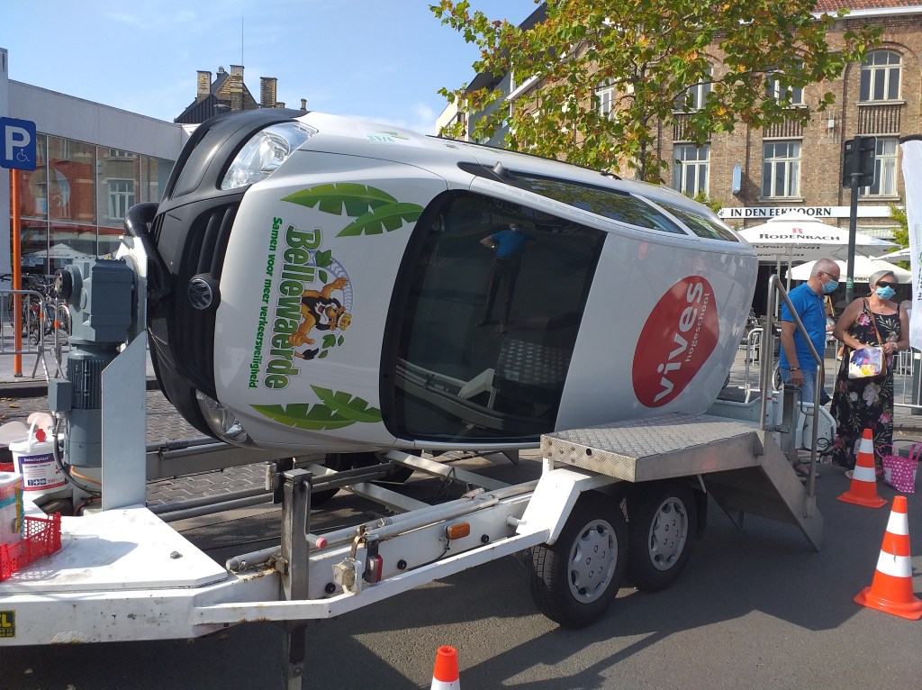 de draaiende auto. Een leuk soort kermisattractie maar dan wel met een serieuze ondertoon