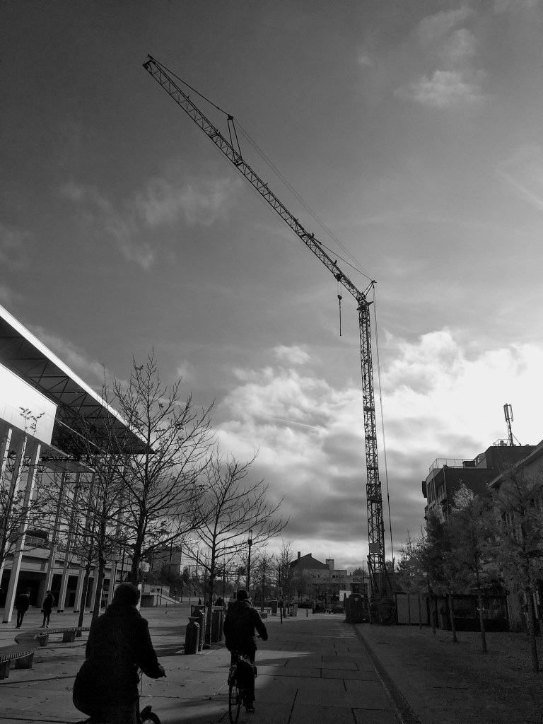 Zondagmiddag ben ik even gaan kijken hoe het er momenteel uitziet, dat stationsplein. De bouwkranen en de materialen die reeds klaar liggen geven het beeld weer van een bouwwerf. Neem je die kale bomen erbij en je krijgt een troosteloze omgeving. De gesloten horeca maakt het beeld niet vrolijker, integendeel. Geen plaats dus om even te vertoeven.