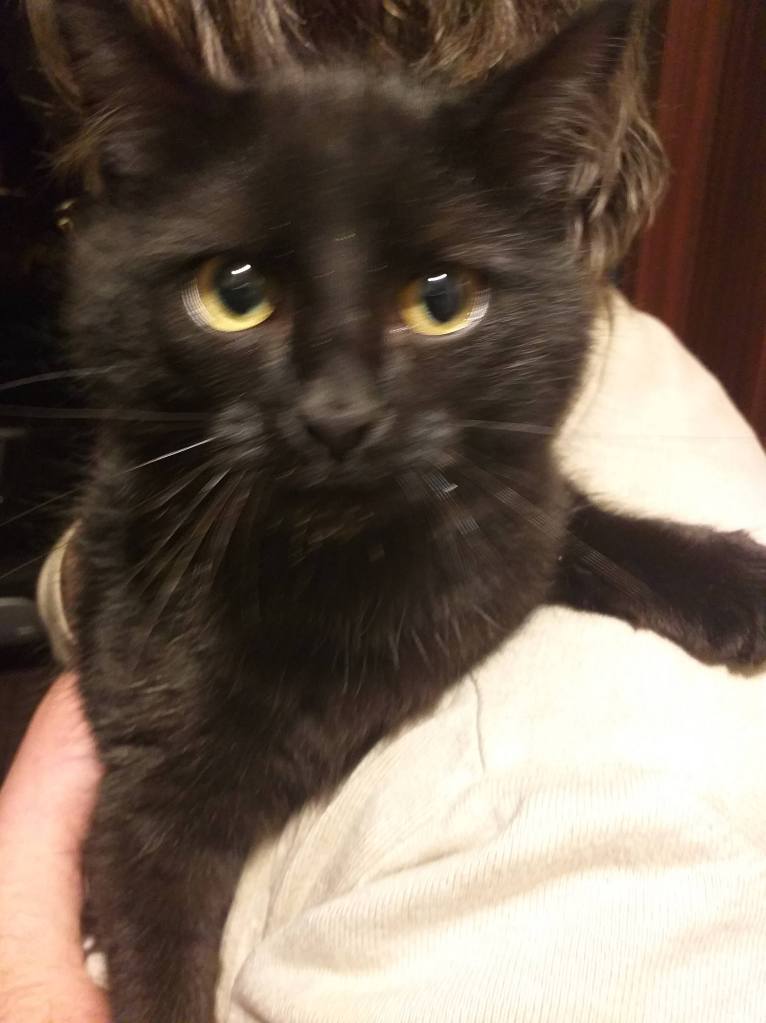 Net wanneer ik de foto wil uploaden zie ik een foto van een kat die verloren is en die sprekend op het katje lijkt dat wij nu bij ons hebben. Die is blijkbaar reeds drie dagen vermist. Zijn woonst is niet zo ver van de onze. Ik geef mijn gsm door aan de vermoedelijke eigenaar want 100 % zeker is het nog niet. Er zijn nu eenmaal veel zwarte katten, maar weinig zwarte met wit op de achterpoten.