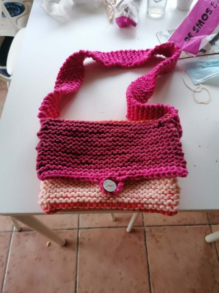 Vorige week kwam Eva thuis van haar tijdbesteding. Ze had een zak bij met daarin een zelf gebreid tasje. Ik heb geen idee hoe je moet breien. Dat laat ik aan de specialisten over onder de lezers. Daar heb ik wel een foto van.