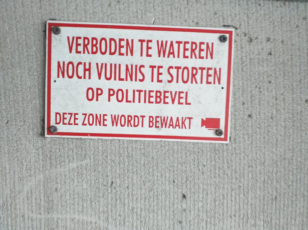 Waar ik van opkeek is dat woordje ‘noch’. Je zou denken dat daar een ‘en’ moet staan. Dan noch blijft het een vreemd bord, maar al waterend en vuilnis stortend (dat snap ik dan weer wel, ik plas ook altijd even terwijl ik de vuilniszak in de container kiep) hoef je je in elk geval je hoofd niet te breken over déze taalkundige kwestie.