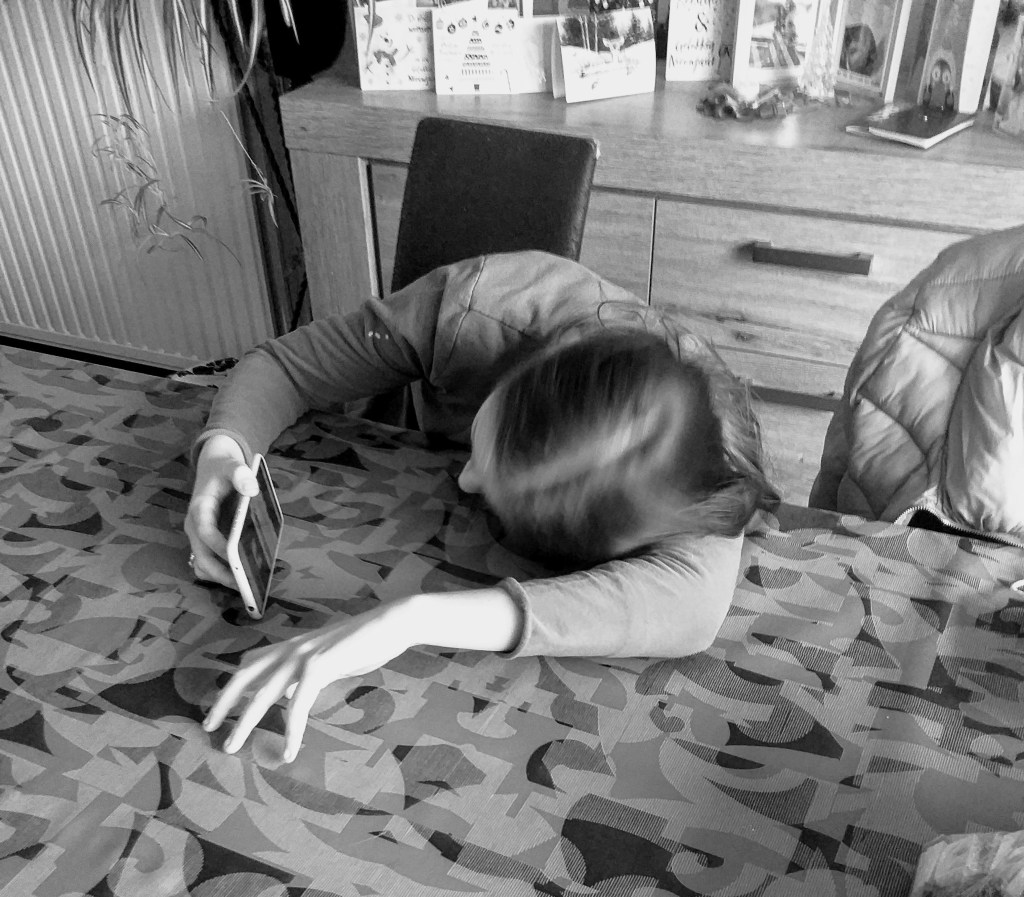 Gelukkig moeten niet alle leerlingen naar school fietsen. Sommigen uit het middelbaar krijgen les via live chat. Zo ook Kleine Muis die daar heel enthousiast over is zoals te zien op de foto. Ze had de leraar in kwestie verwittigd dat ze weg moest met haar mama, maar die was onverwurmbaar. Zij MOEST aanwezig zijn tijdens de live chat. De verbinding kwam niet zonder moeite tot stand. Eens zien en luisteren wat “dienen Pipo” weet te vertellen. “Saaaai” hoorde ik regelmatig gevolgd door een zucht. De leraar had de moeite gedaan om een power point presentatie te maken opdat alles duidelijk zou zijn, maar Kleine Muis bleef er niet wakker bij. Even dacht ik dat haar smartphone door de living zou geschoten worden, maar gelukkig bleef het bij dreigen. Tenslotte werd de verbinding verbroken. OEF ! “Is de leraar dood gevallen ?” grapte ik. “IK HOOP HET !” was haar eerlijk antwoord. Dan maar een eenvoudige doch niet zo heel erg voedzame maaltijd gehaald. Zoute friet met sla die volgens mij naar plastiek smaakt, maar wie ben ik ?