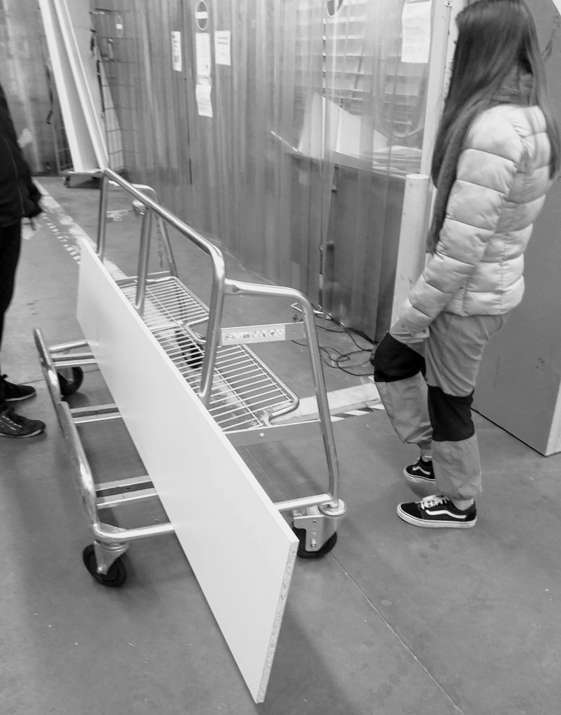 Gewapend met de juiste afmetingen stappen we de Gamma binnen. Grote Muis heeft zo’n kar genomen waar je planken makkelijk kan op leggen. Daar haar brilglazen mistig beginnen worden moet Kleine Muis haar mama regelmatig corrigeren. Voor je het weet loopt ze verloren of neemt ze ongewenst een deel van de rekken mee.