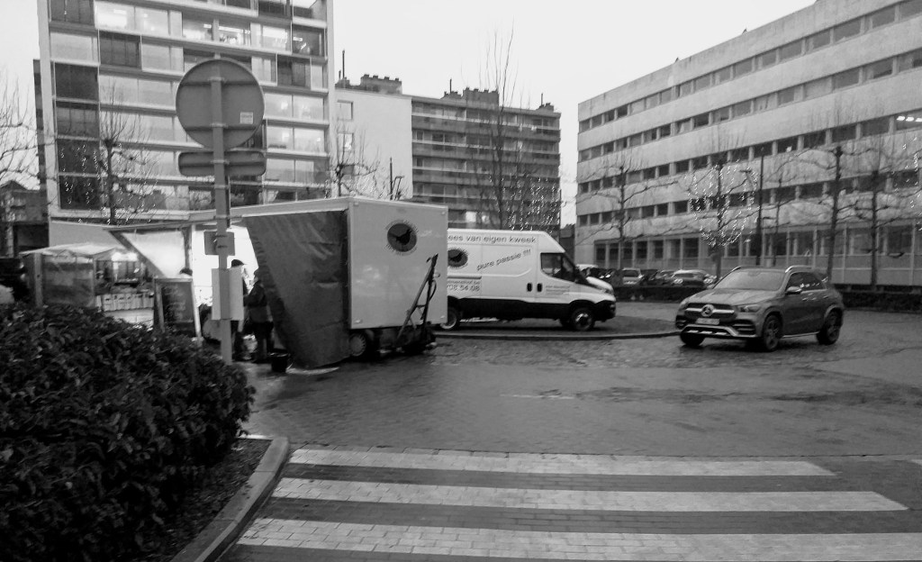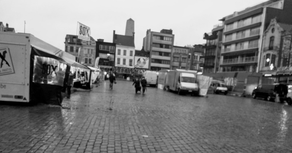 Op het Polenplein waar zich de kramen bevinden met voeding was het nog te doen. De meesten waren afgekomen. Op de Grote Markt was het heel wat minder wat de opkomst betreft. De Botermarkt, daar was het om te wenen. Hier en daar een bezoeker die zich zo vlug mogelijk uit de voeten maakte met de koopwaar. Soms waren er meer toezichters dan bezoekers van de markt.