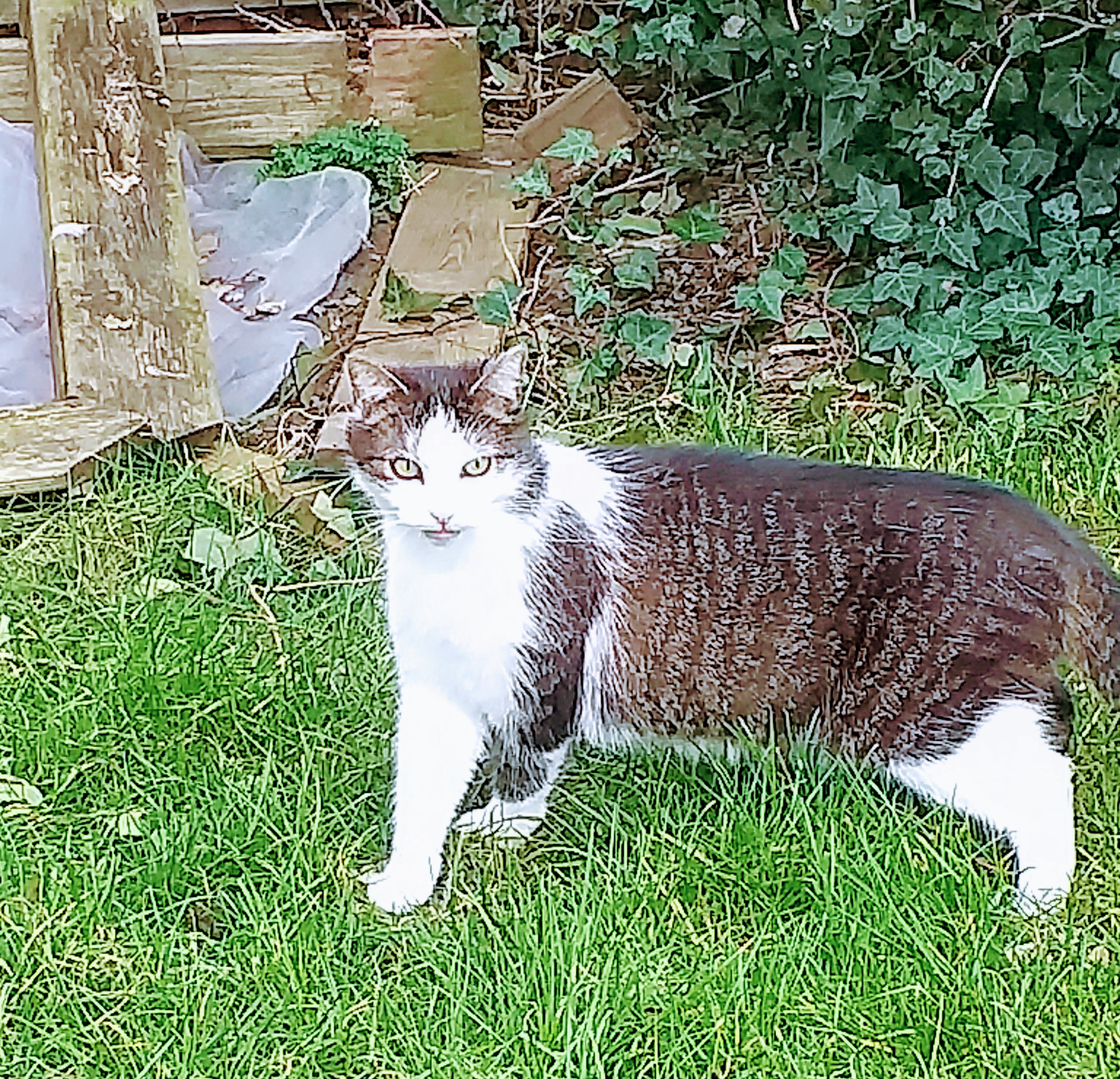Nu heeft hij afgelopen week (letterlijk) een volgende stap gezet : naar buiten in de tuin. Eerst argwanend kijken naar buiten, maar toen Annabel naar buiten ging volgde hij aarzelend. Volgens Eva heeft hij ondertussen vrienden gemaakt met een buurtkat.