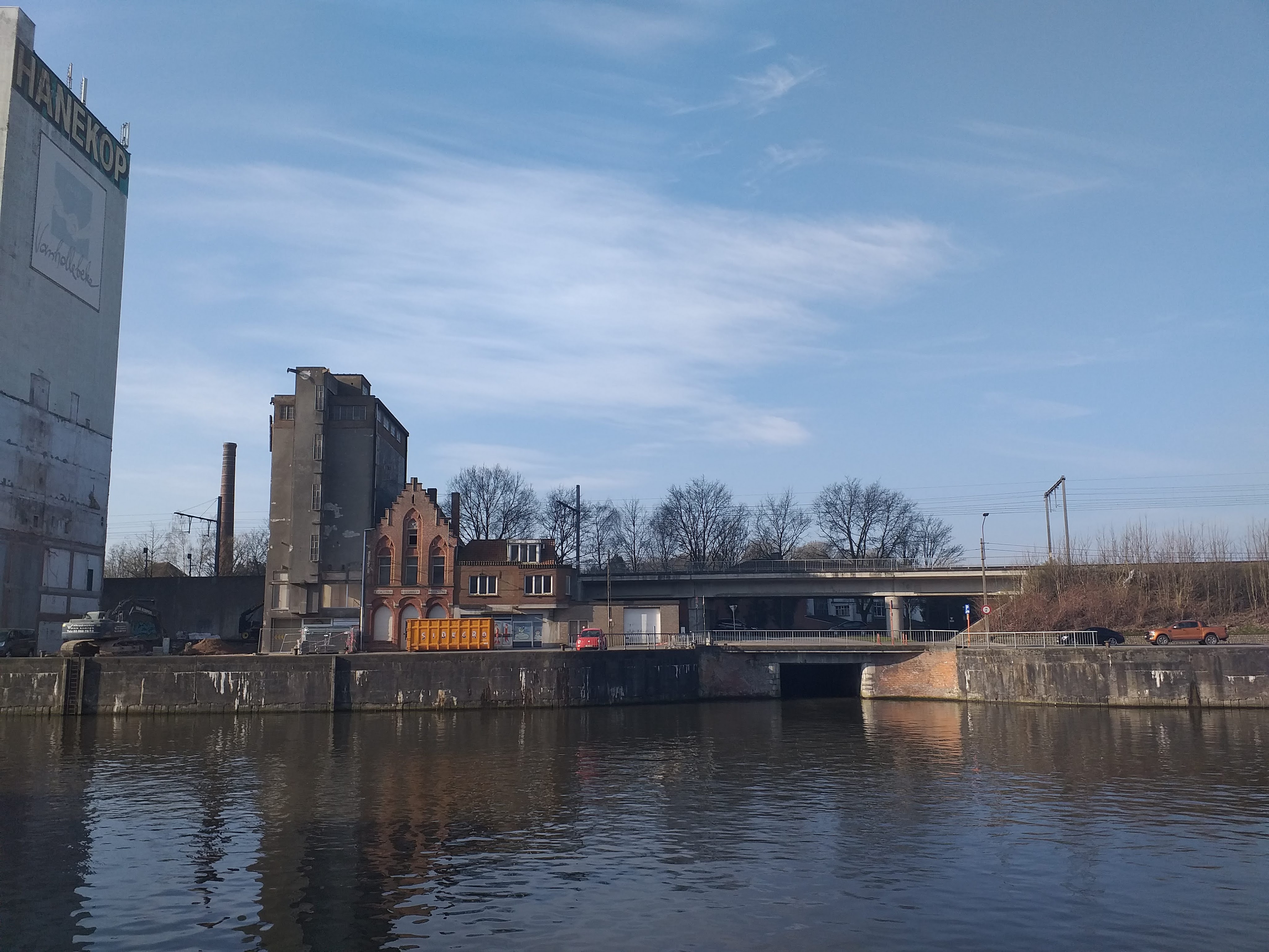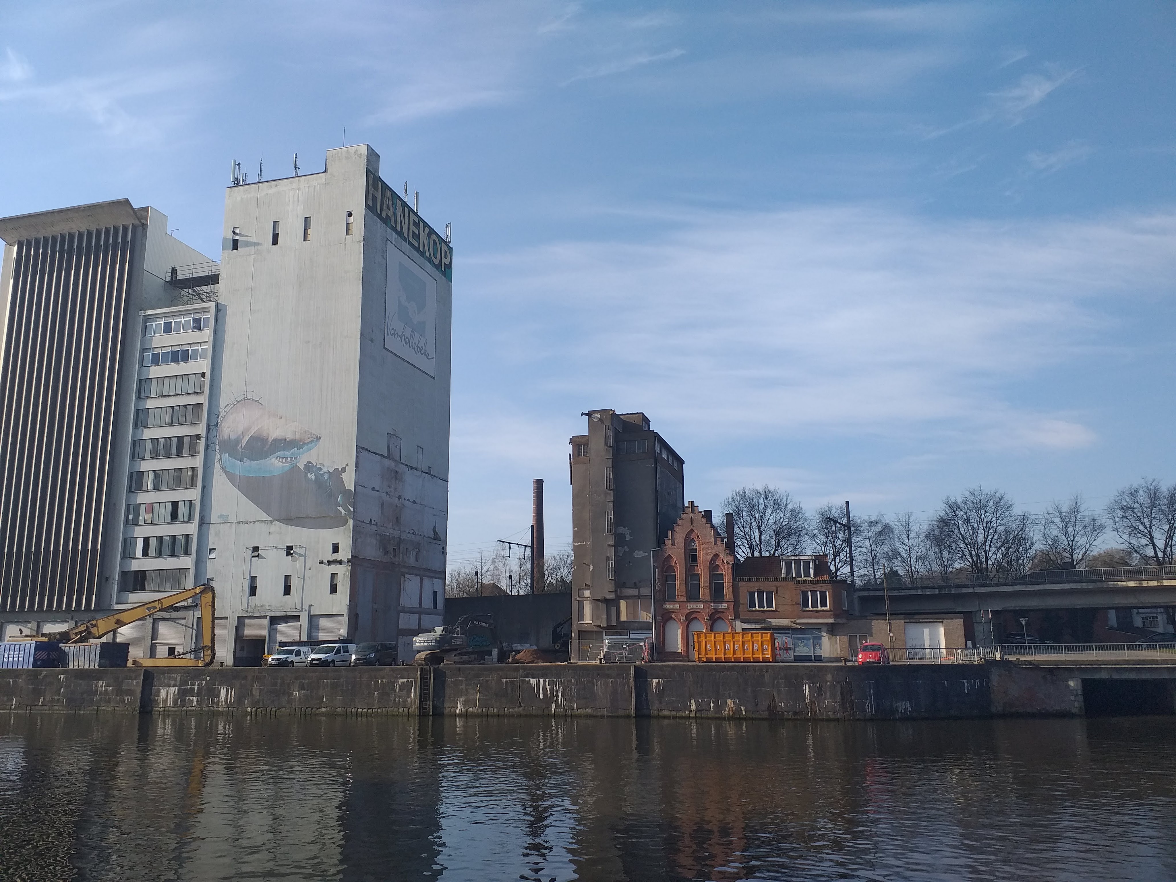 Deze morgen reed ik door de haven en bleef stilstaan ter hoogte van de afbraakwerken aan de site van Hanekop. Eens zien hoe deze werken evolueren. Toen ik nadien de foto’s bekeek viel mijn oog op ene waar ook het water van het kanaal te zien is.