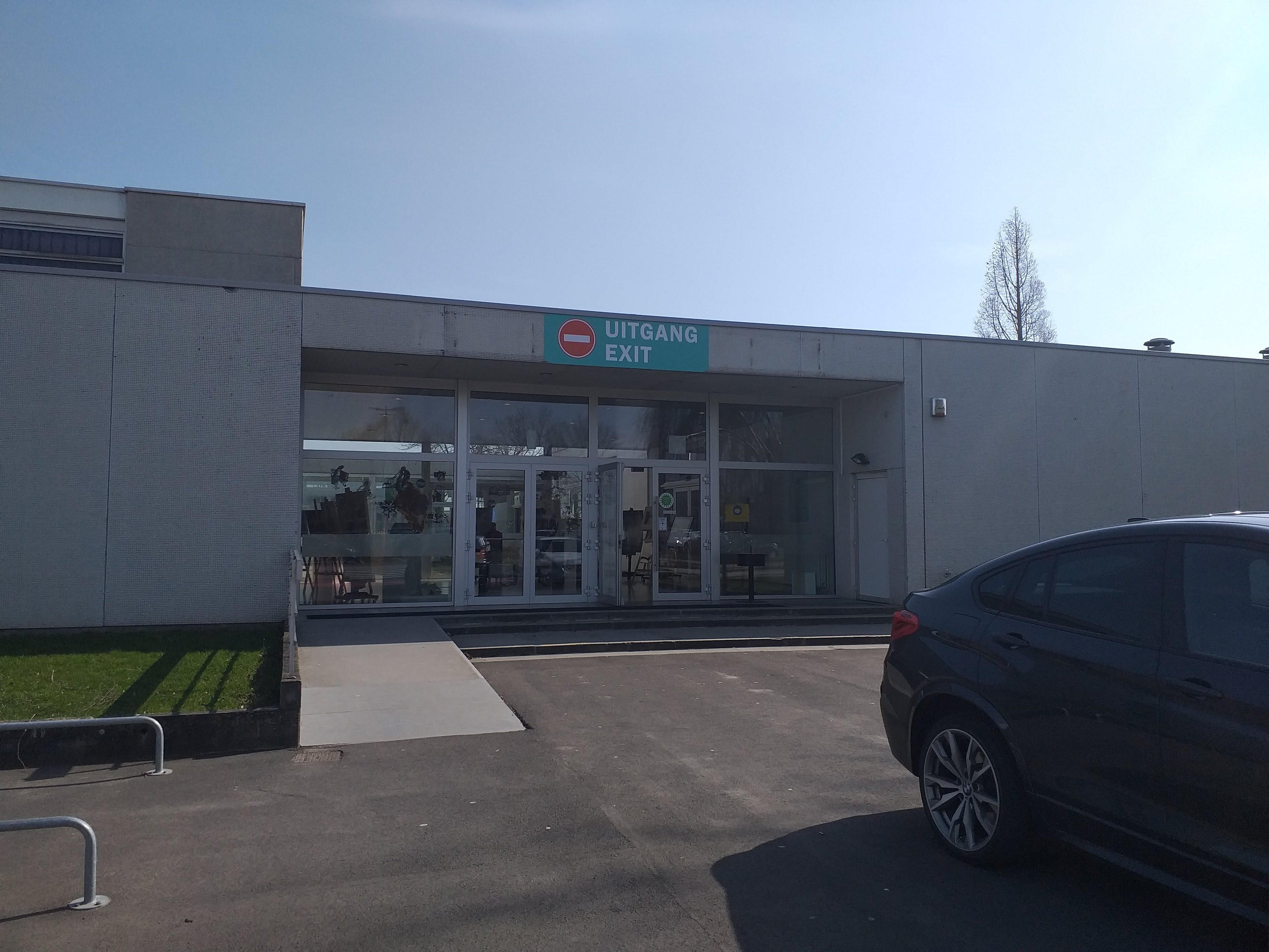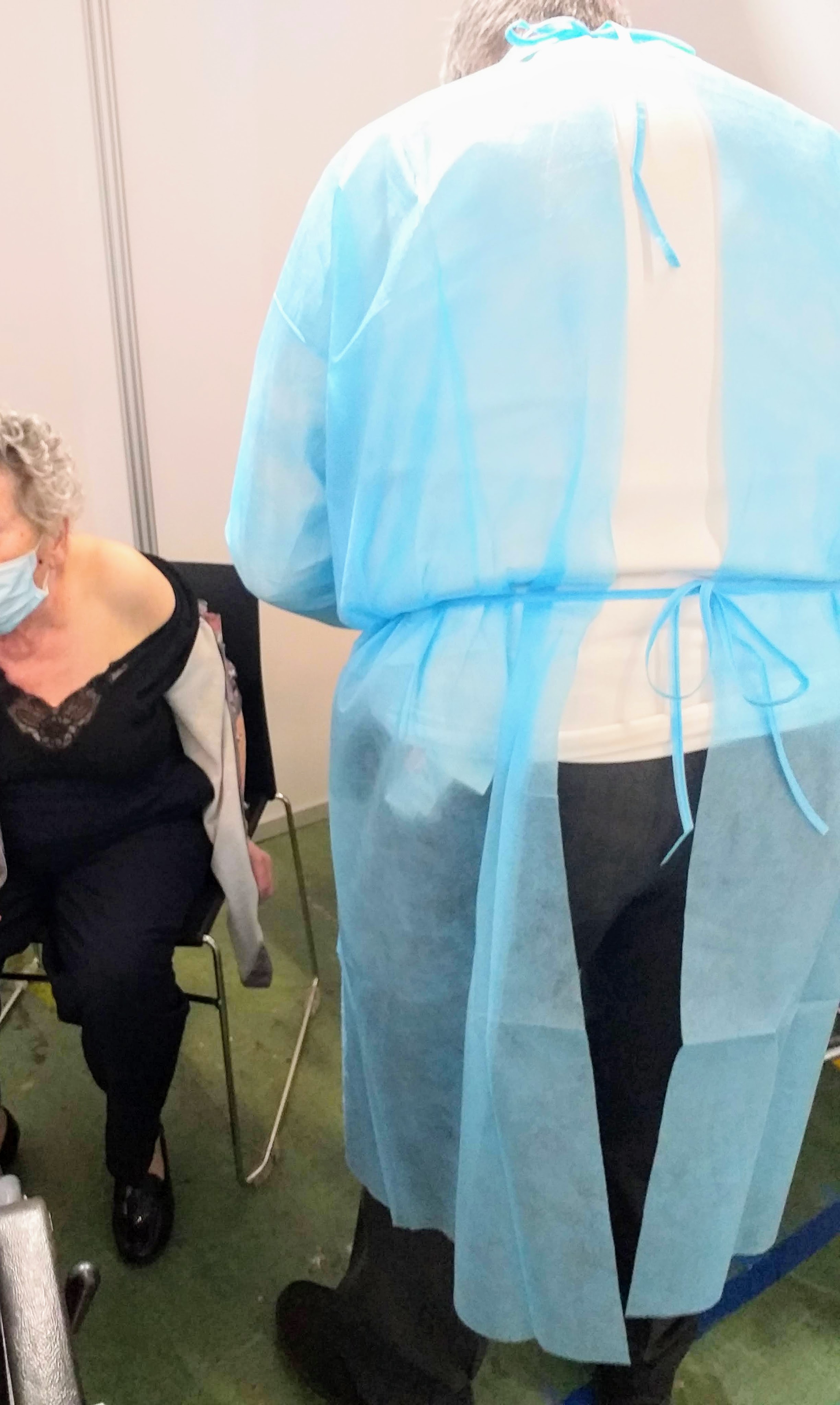 We werden vriendelijk verwelkomd. Ze werd een rolstoel aangeboden. Na enige aarzeling nam ze die toch maar aan. Na handen ontsmet te hebben moest ze zich aanmelden aan het onthaal. Identiteitskaart werd gecontroleerd en dan gingen we weer verder. Om te weten waar je moest zijn werden moest men het kleur volgen die men toegewezen kreeg.