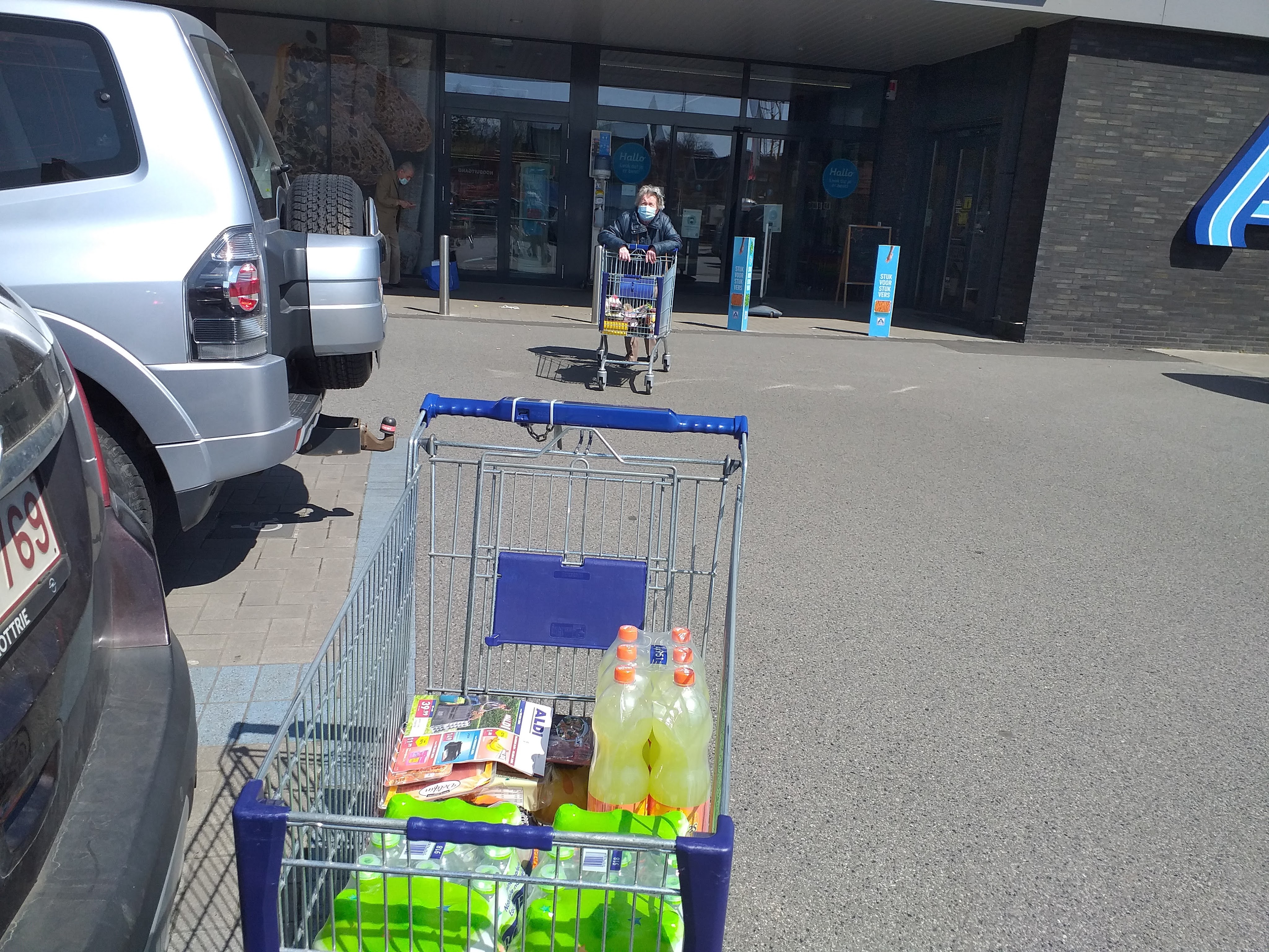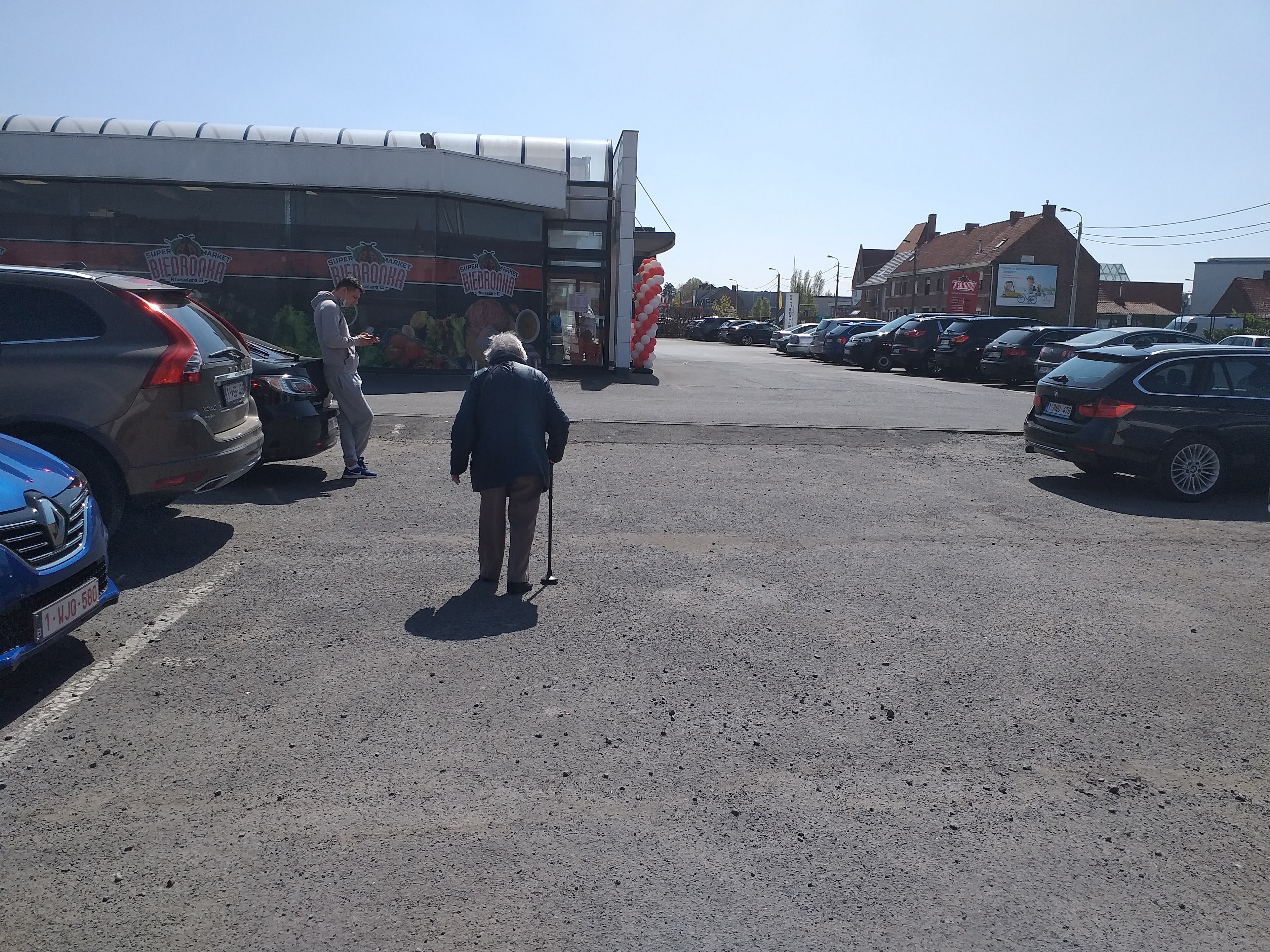 Het is vlak na de middag als ik samen met mijn moeder de parking van de Aldi op rijd. Zoals steeds stapt ze met veel moeite uit de auto. Net op het moment dat ik haar een kar geef om mee naar binnen te nemen hoor ik een iets vallen. Ik kijk om en zie midden de parking een bejaarde vrouw en haar fiets op de grond liggen. Samen met nog twee mannen die precies vanuit het niets opduiken gaan we op de onfortuinlijke vrouw af. Blijkbaar heeft ze met de hiel van haar schoen blijven haperen aan de propvolle fietstassen en daardoor ten val gekomen. Terwijl de ene man haar rechtop helpt nemende andere man en ik de fiets. Het is een loodzware elektrische fiets met propvolle fietstassen. De huidige e-bikes zijn veel lichter bedenk ik me. Gelukkig is de vrouw niet gewond. Wel zwaar geschrokken en onder de indruk.