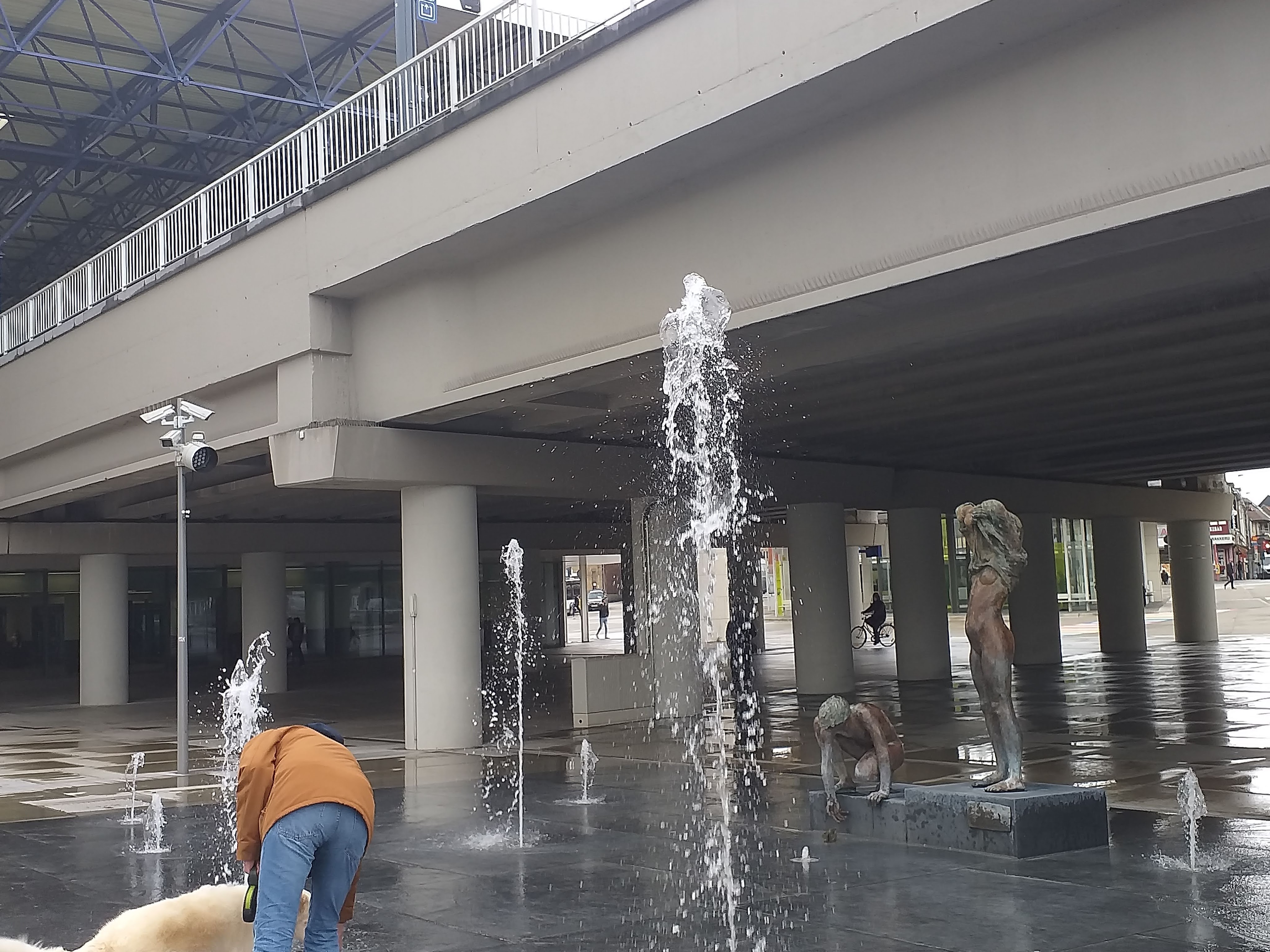Zo te zien spuiten de fonteinen op het stationsplein ook weer. Er is nochtans genoeg water uit de lucht gevallen de laatste dagen. De hond op de foto genoot in ieder geval.
