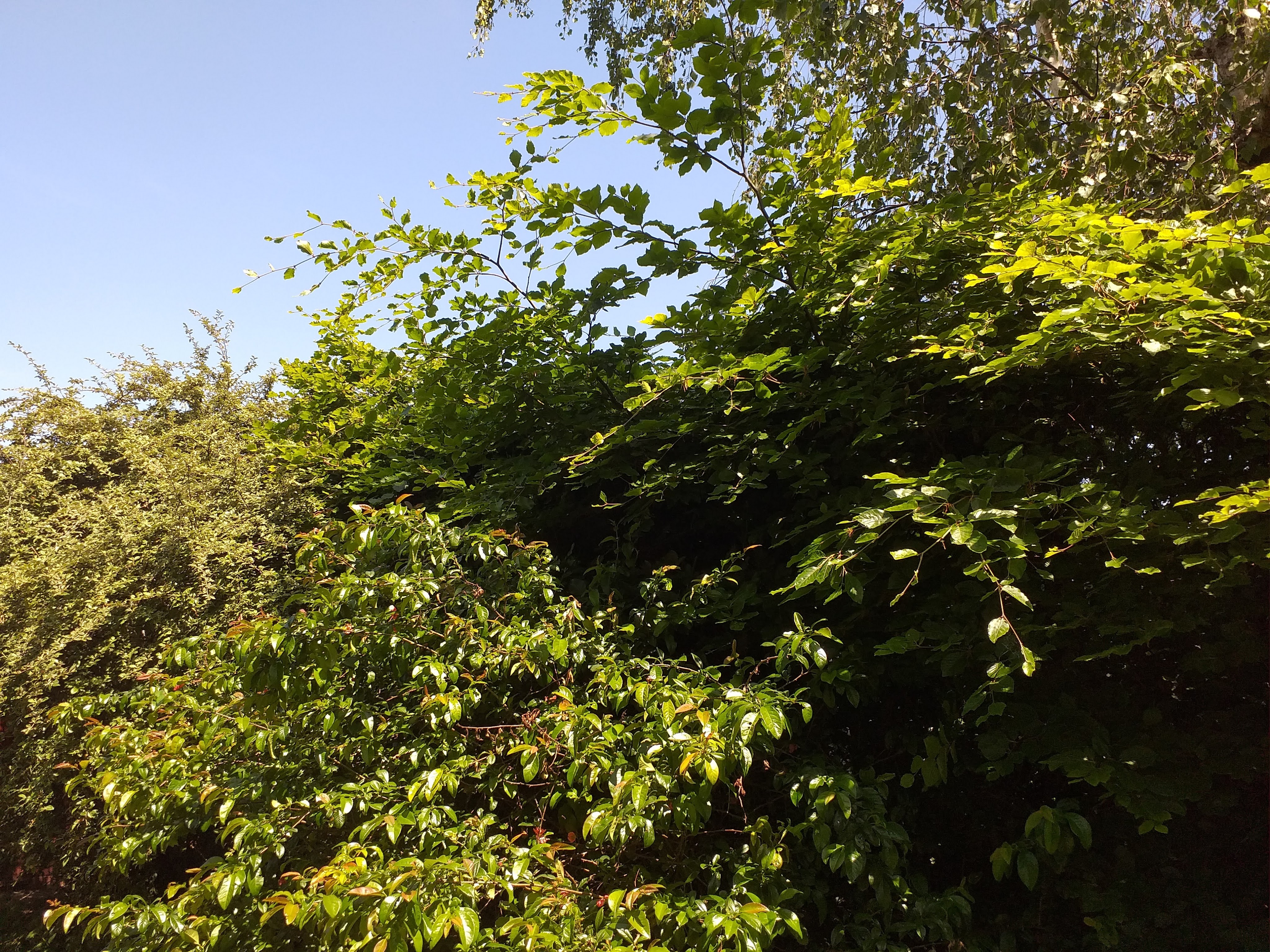 Ook het snoeiwerk laat ik wachten. Nu staan de bomen en struiken er mooi bij en ik zou het zonde vinden daar mijn zaag in te zetten. De haag die ons met de buren uit een andere straat scheidt staat er overdadig bij. Nu zal ik die haag zeker niet snoeien anders kan ik meegenieten wat er bij de buren zoal gebeurt.