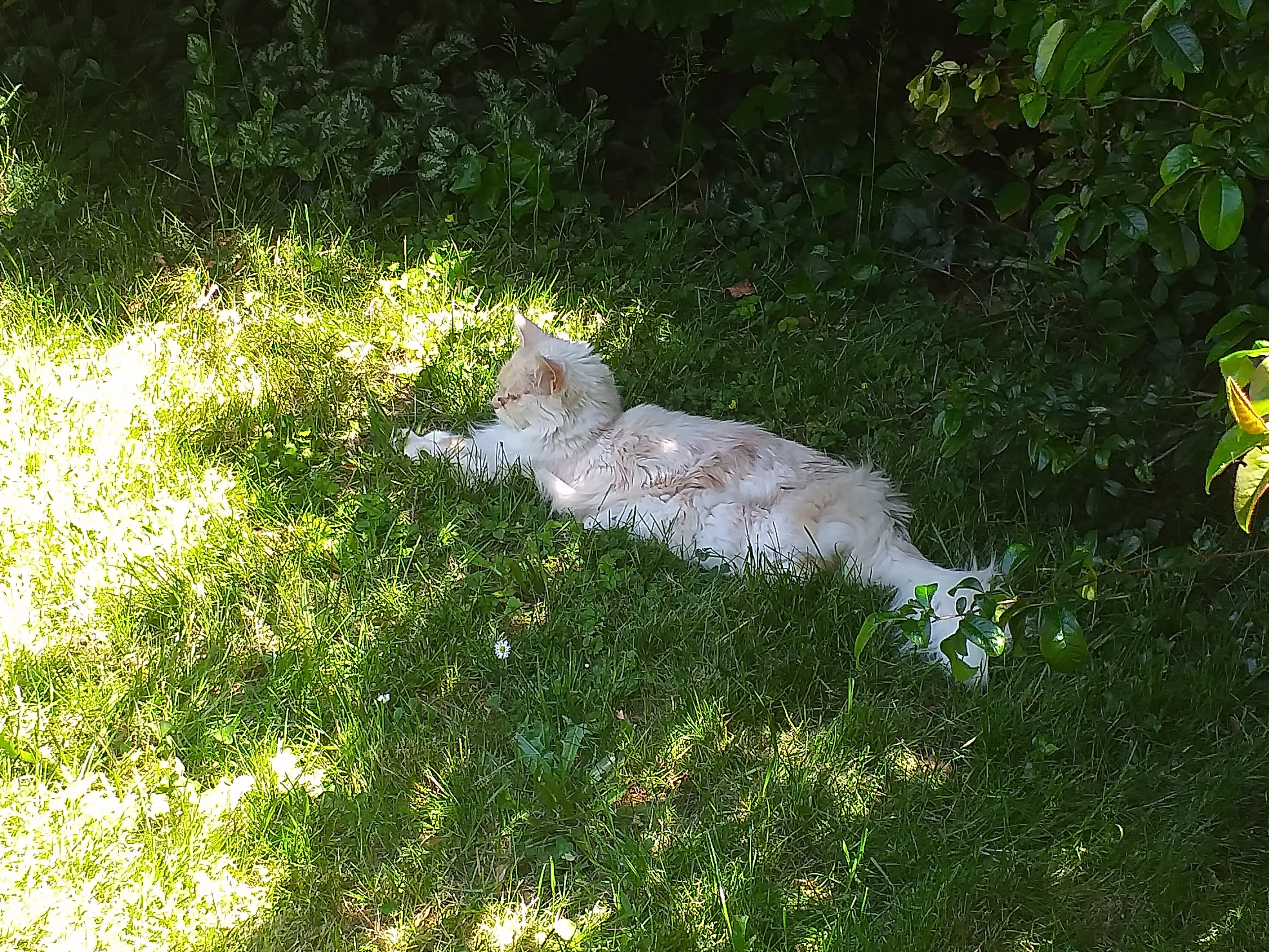 Dat mijn composthoop zowat onzichtbaar geworden is, daar zal ik wel iets aan moeten verhelpen. Door de groeischeuten van de bomen is er nu ook veel schaduw te vinden en daar genieten onze katten en de buurtkatten met volle teugen van. Vooral tijdens het weer van de afgelopen dagen.