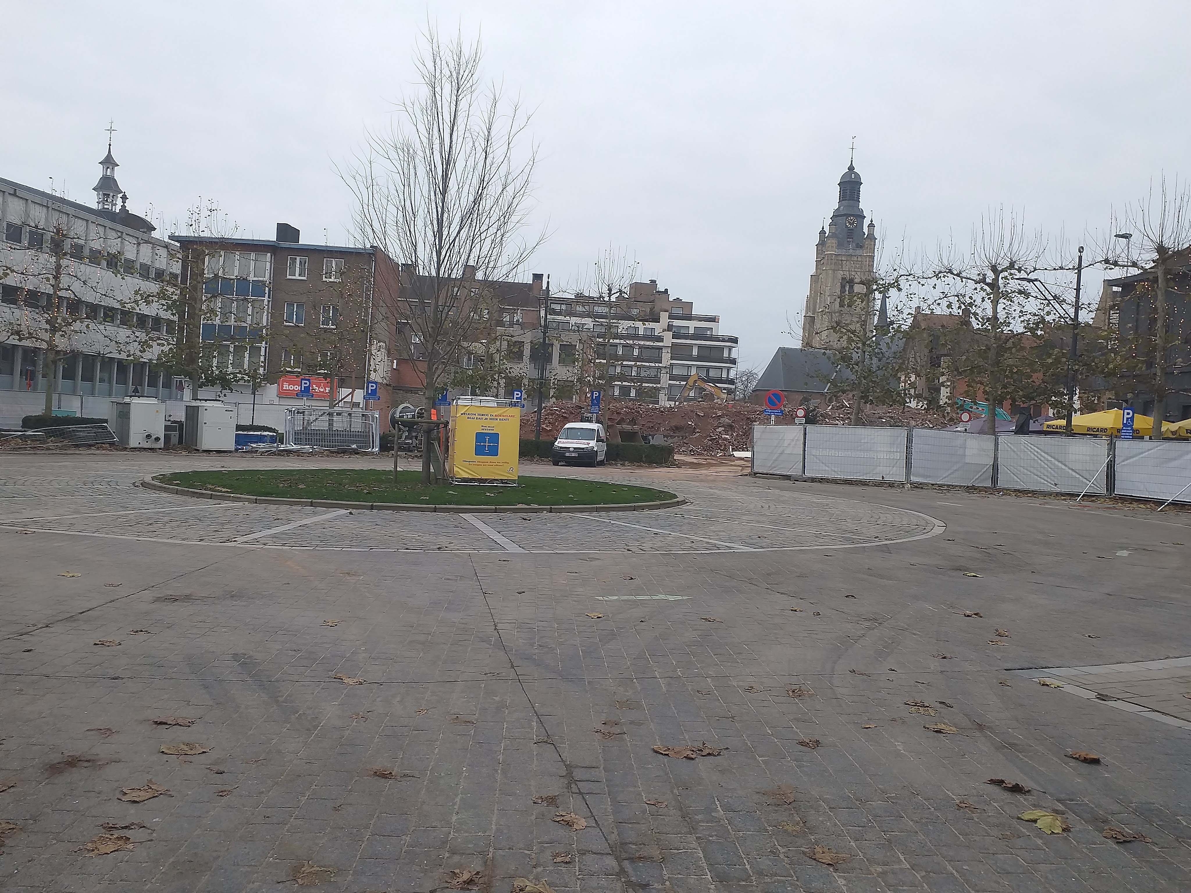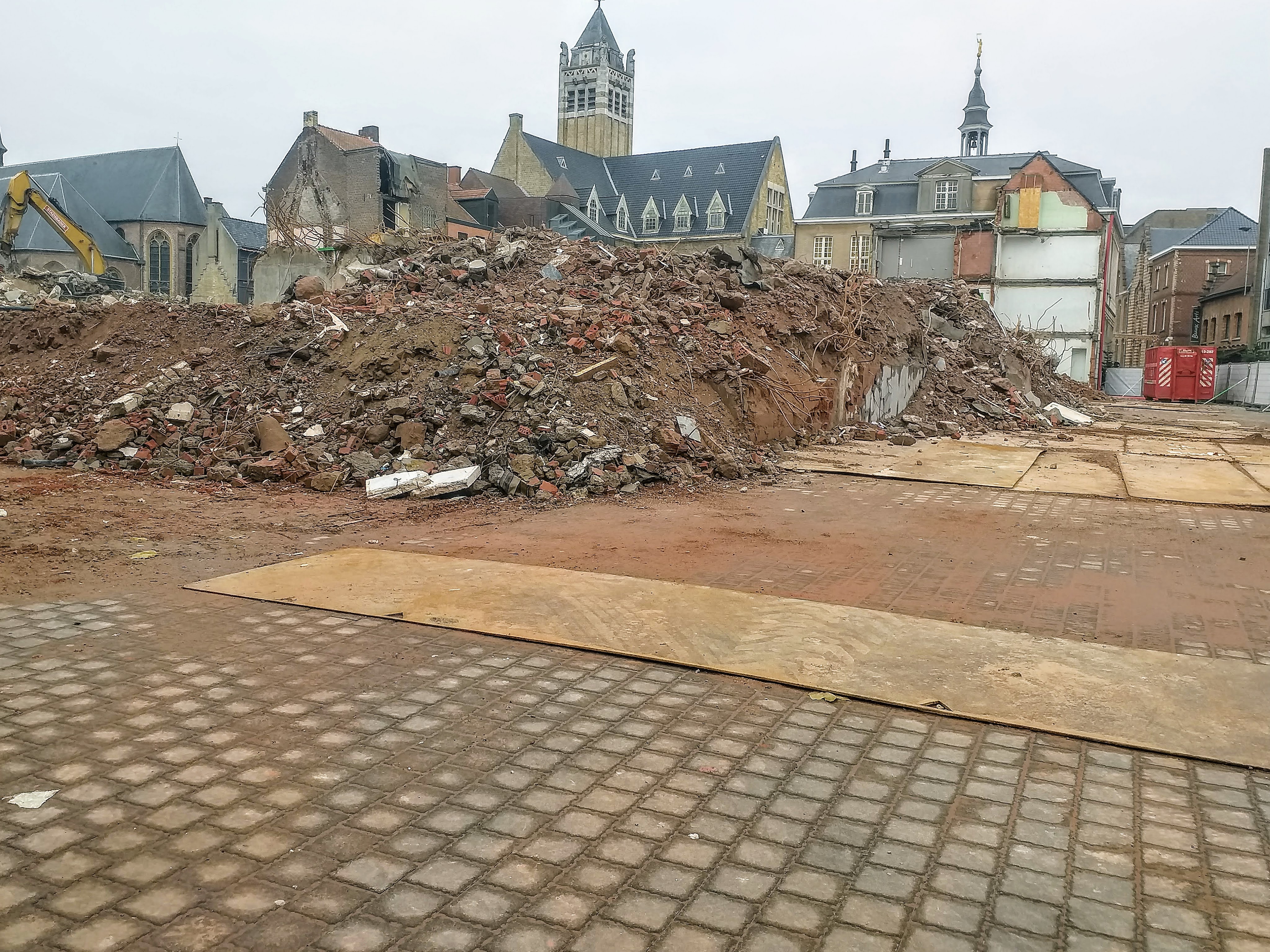 Hierboven zicht op de Botermarkt die momenteel als werfplaats gebruikt wordt. De Sint-Michielskerk is nu zichtbaar van op plaatsen waar je ze vroeger niet kon zien.