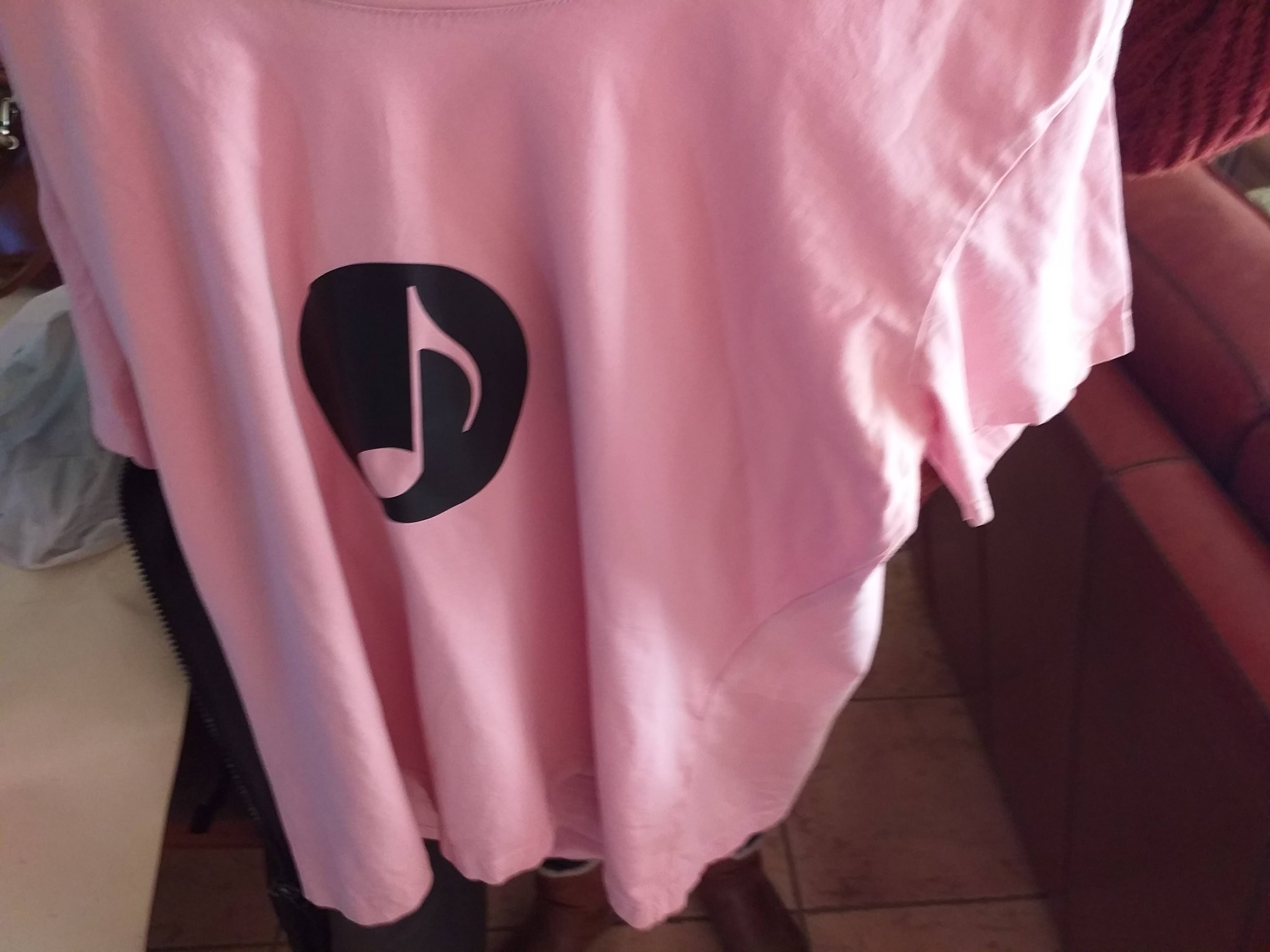 Dinsdagnamiddag kon Eva deelnemen aan een cursus T-shirt bedrukken. Alle deelnemers moesten zelf een T-shirt meebrengen. Daar mochten ze een logo of wat dan ook kiezen. Eva koos voor een muzieknoot. Op de foto zie je dus het resultaat.