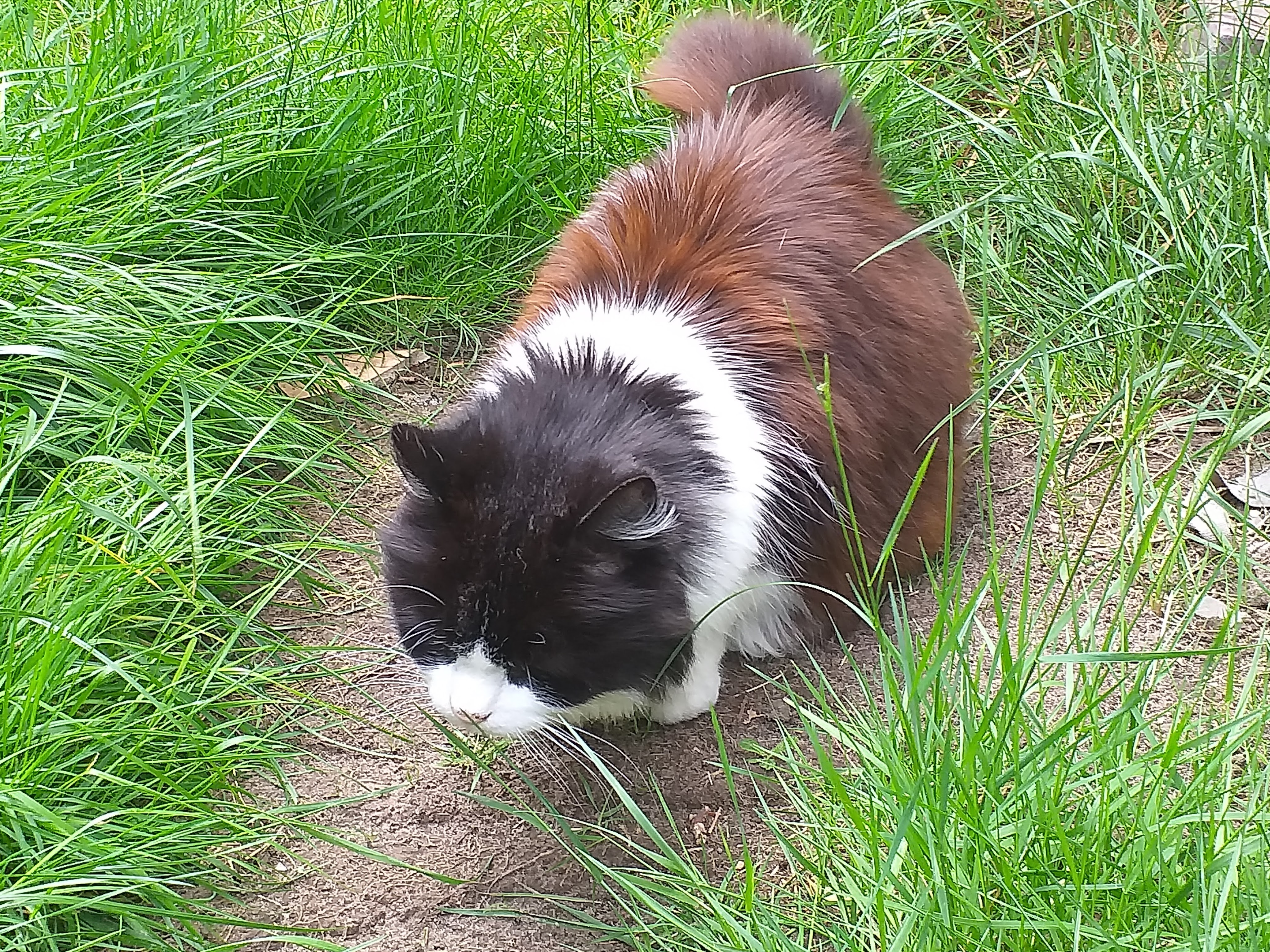 Annabel die zich aan het uitleven is in de tuin. Het gras heb ik tenslotte toch maar gemaaid. Achteraf was een merel druk op zoek naar lekkers tussen het korte gras.