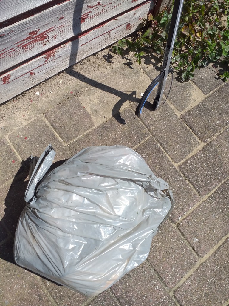 Tijdens mijn rondje zwerfvuil kwam ik voorbij een haag waartegen ik een (zak hierboven op de foto) zag liggen. Duidelijk een geval van sluikstort. De vrouw wiens huis achter die haag staat liet me weten dat ze die zak in haar tuin gevonden had. Ze besloot die langs de straatkant van de haag te leggen. Niet wetende dus dat dit niet mag. Ze had de milieudienst van stad moeten verwittigen. Die zou dan de zak komen ophalen en meenemen en proberen uit te vissen wie die zak daar gesmeten of gelegd heeft.