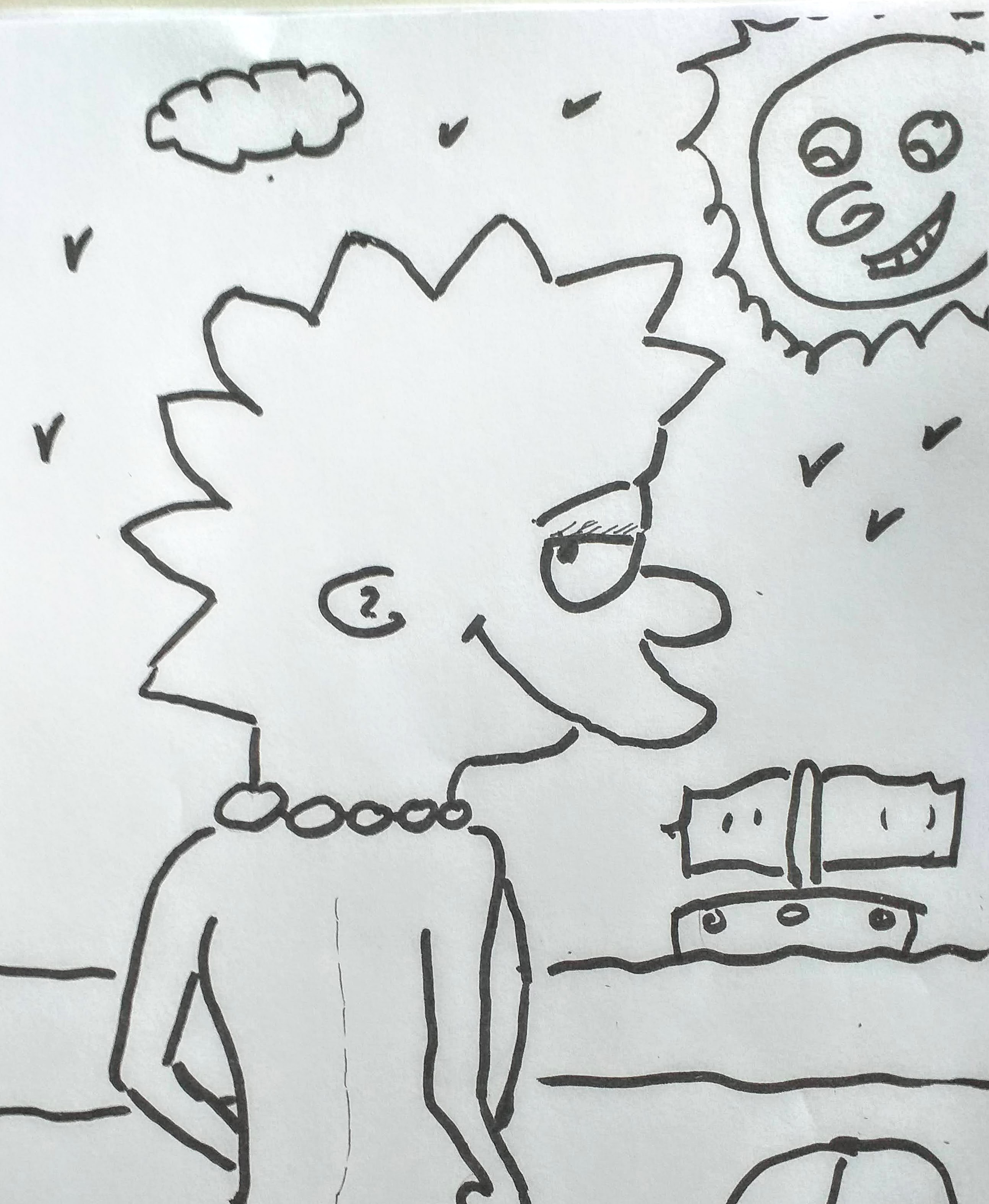Dit is een deel van de tekening. Deze wordt heden ingekleurd en afgewerkt. Dit moet Lisa Simpson voorstellen.