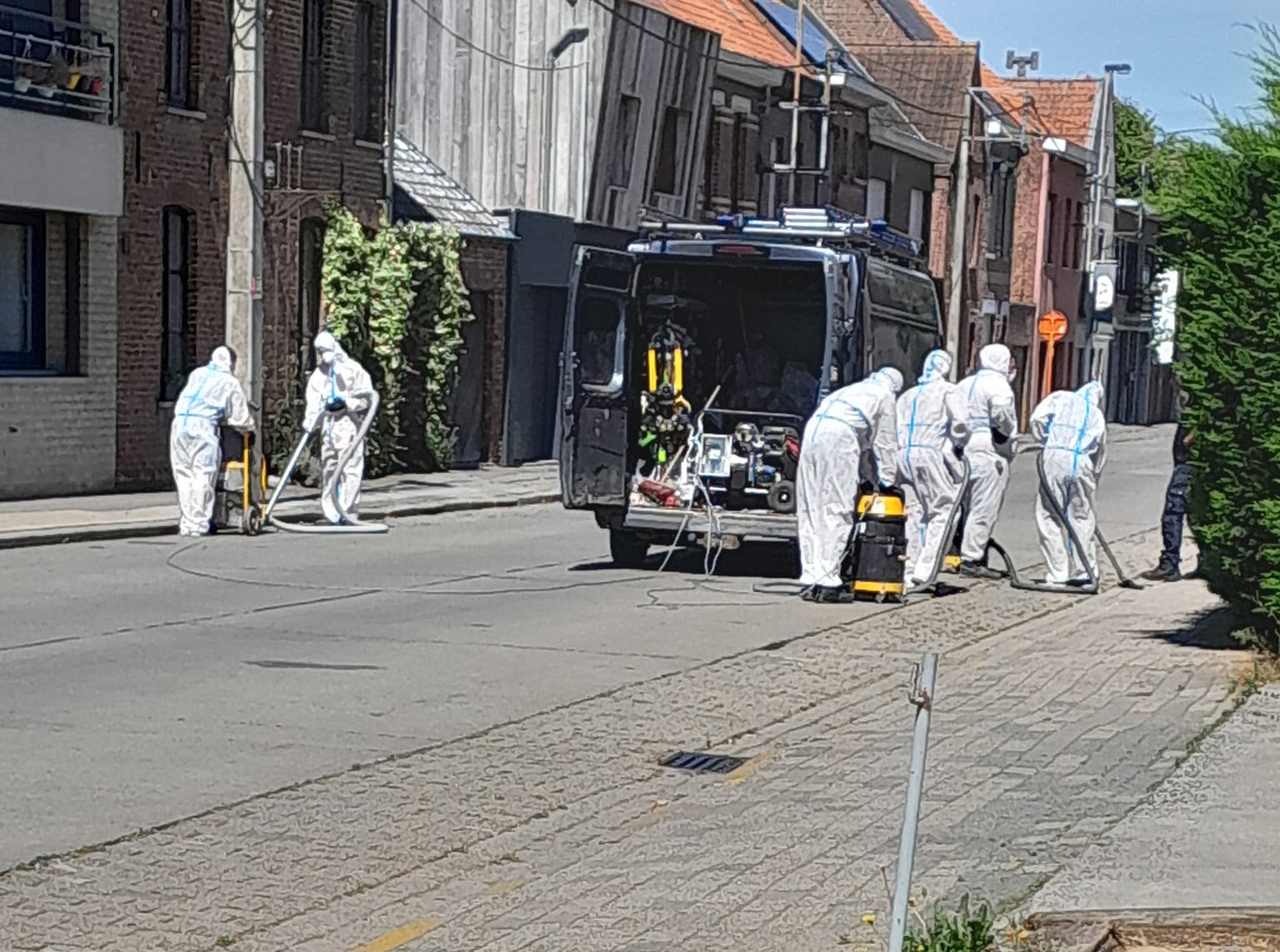 Het leek een scène uit één of andere goedkope SF-film, maar dat was het niet. Geheel gekleed in “ruimtepakken” trokken een groep “aliens” rond de middag door de straat. Doel was het opruimen van asbest die tijdens de brand van vorige vrijdag over de buurt uitgestrooid werd. Normaal gezien doe ik daar mijn rondje zwerfvuil, maar daar was ik deze week nog niet mee begonnen. Misschien maar best ook gezien de eventuele aanwezigheid van asbest. Ik draag weliswaar steeds handschoenen maar toch. Nu is het er weer veilig.