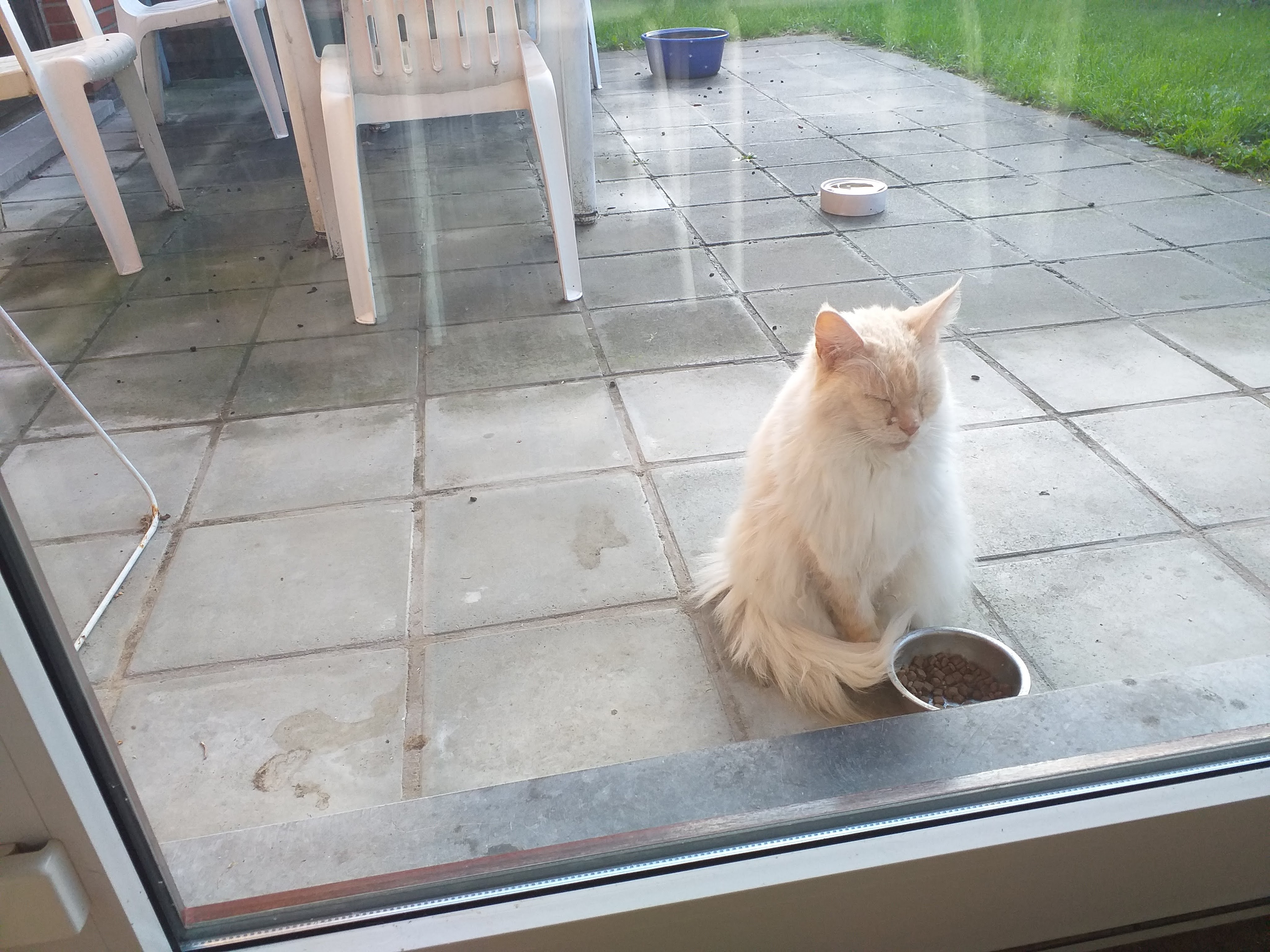 In feite is het hier iedere dag dierendag. Toen ik deze morgen opstond zat Kesha aan de achterdeur te janken om haar korrels. Deed ik het rolluik van de voorste venster omhoog kwam Seba aangestormd in de straat. Het is hier precies een luxe kattenhotel geworden.
