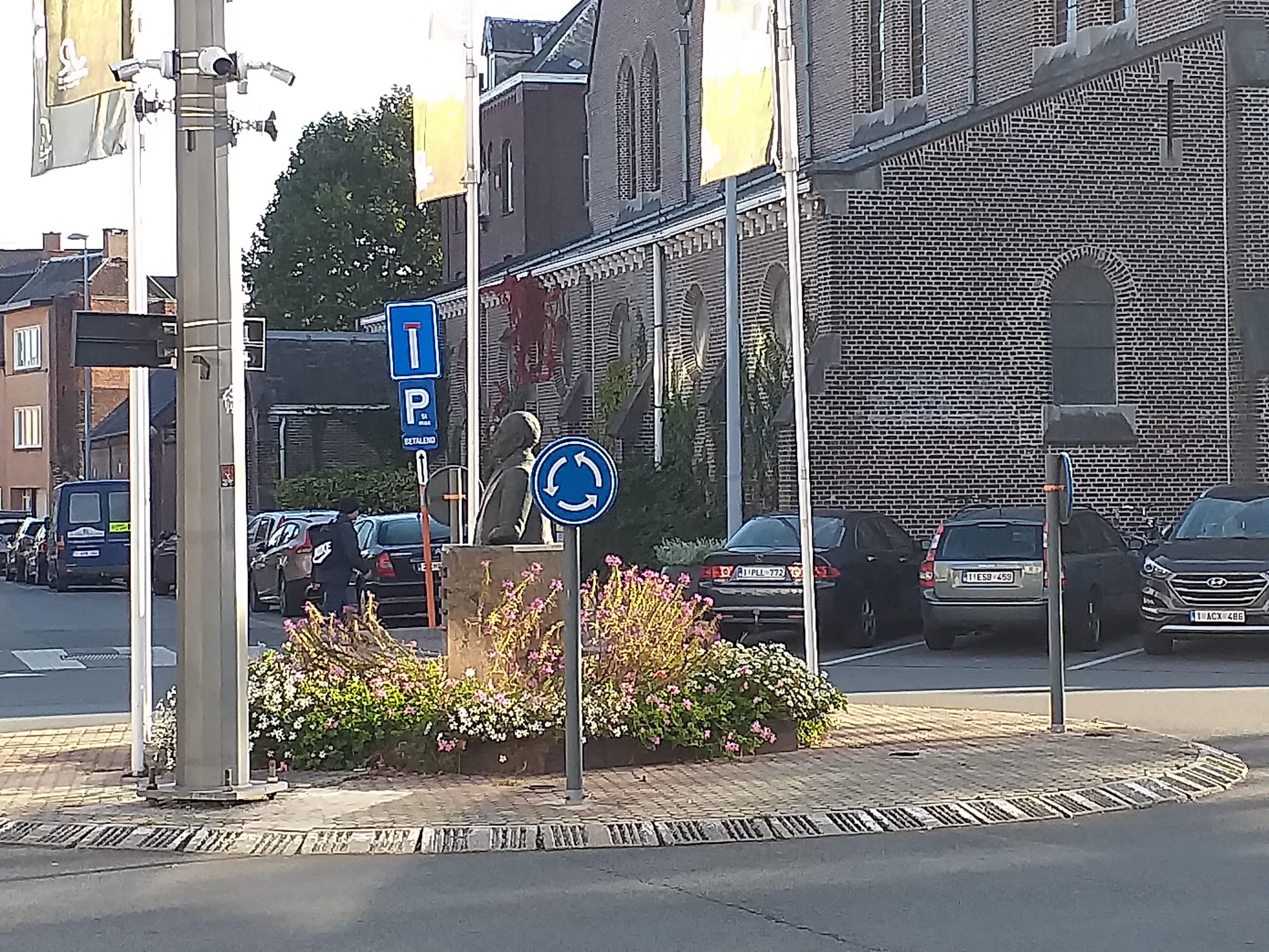 Vlak voor de kerk is er een rotonde. Daarop staat een beeld van de bekende schilder Alfons Blomme die buiten Roeselare volgens mij volledig onbekend is.