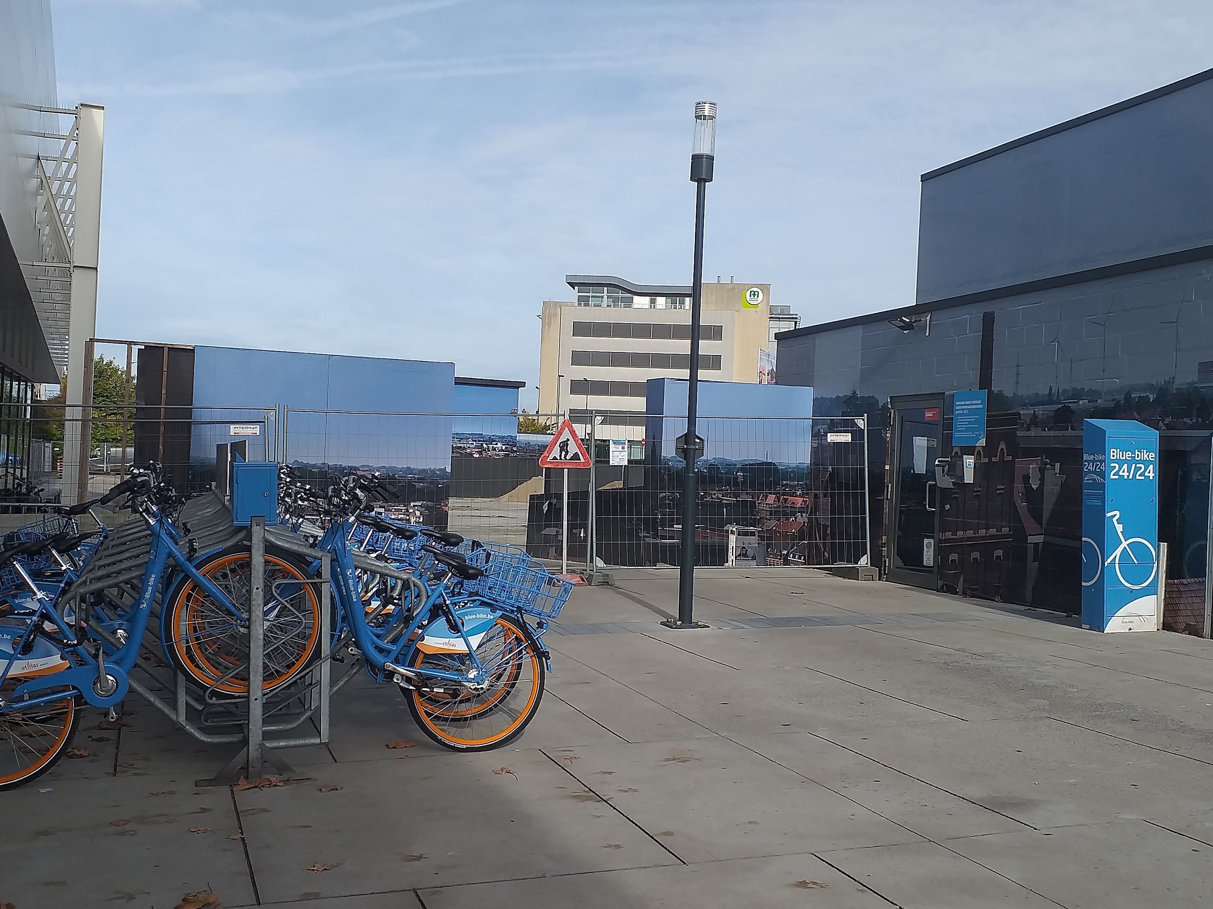 Achter het station staan de blue-bikes. Huurfietsen die niet van het fietspunt zijn maar ze wel onderhoudt.