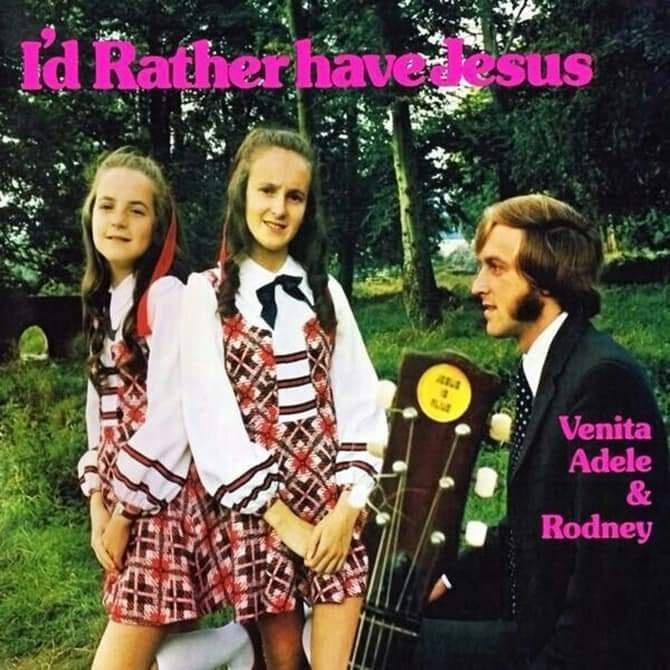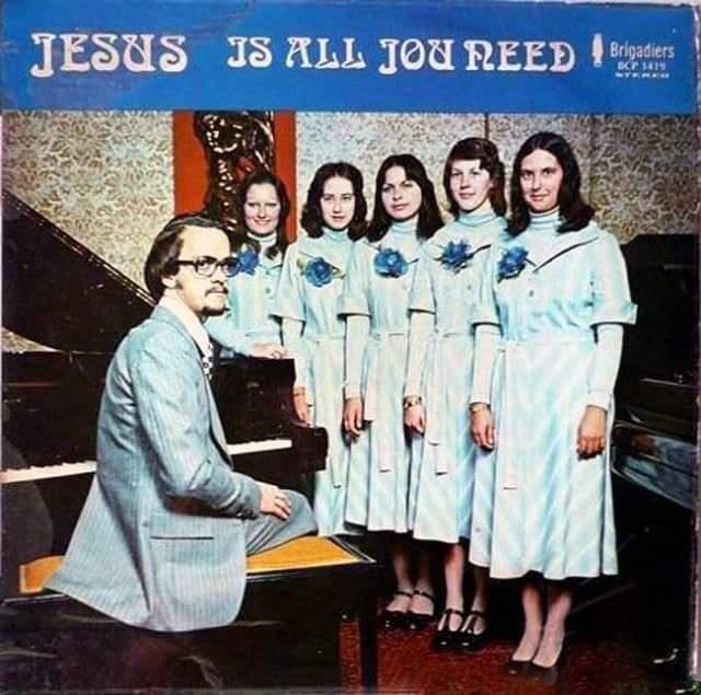 Dat deze jonge deernen liever Jezus dan die jongen is duidelijk te merken. Omwille van Jezus houden ze hun handen zedig tegen hun iets te korte rok. De jongen met gitaar zal ook wel muziceren in name of the lord. Het kan natuurlijk zijn dat hij dat instrument na de fotoshoot opzij legde en een ander instrument ter hand nam voor de vleselijke lusten des duivels. Amen ?