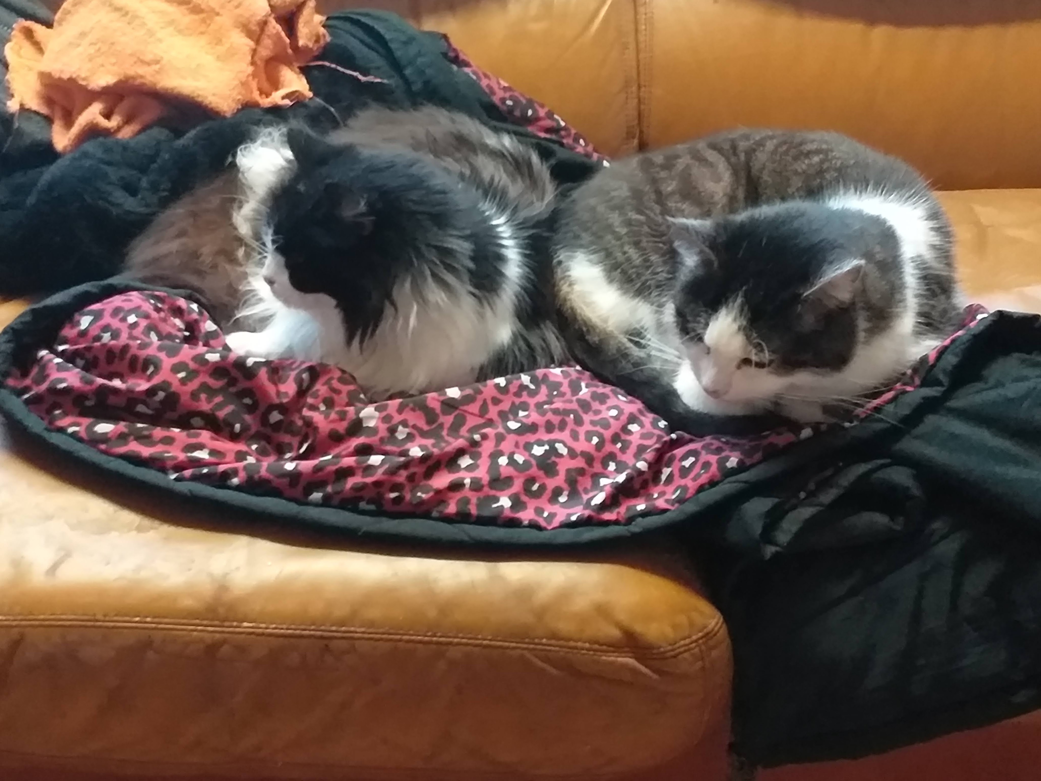 Ook de katten hielden zich rustig. Hier boven liggen ze als broer en zus mooi naast elkaar op een in beslag genomen jas.