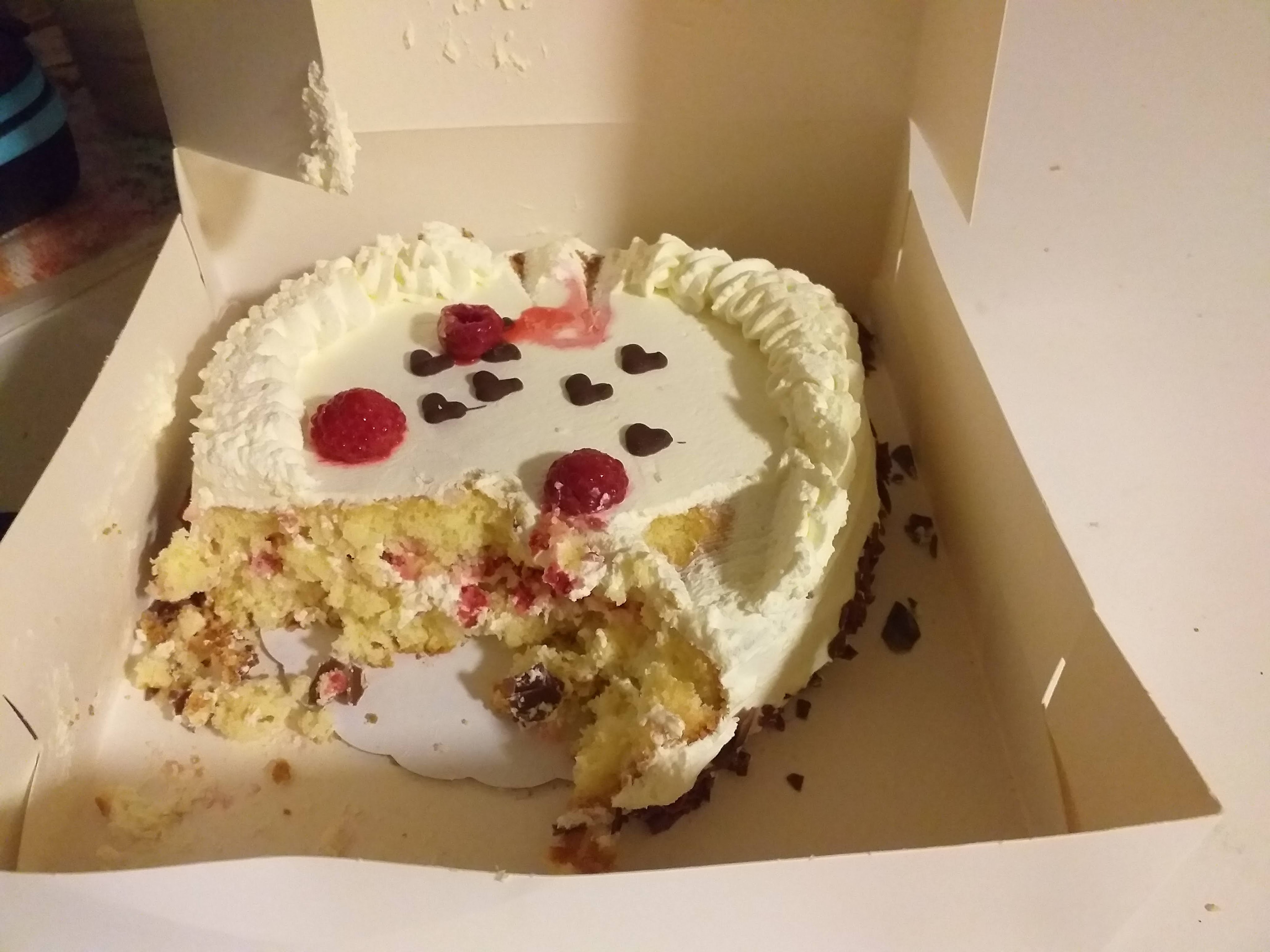 Hier is iemand heel enthousiast aan de taart begonnen zonder te snijden 😉