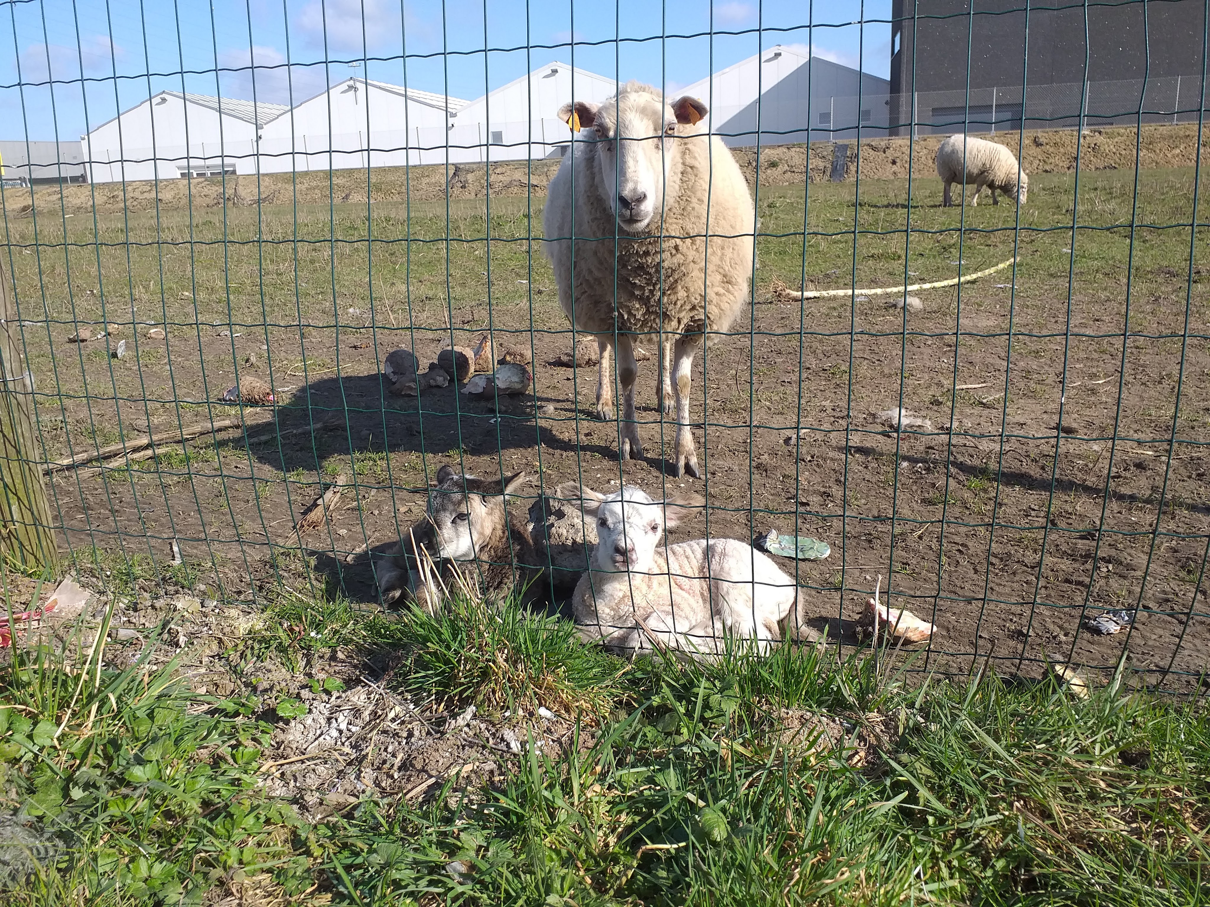 Toen ik vrijdag de Muizen bij hen thuis had afgezet reed ik weer verder. Niet ver van waar de Muizen wonen zag ik dit schaap met lammetjes. Vlug de wagen aan de kant gezet en eens van dichterbij gaan kijken. Een koppel dacht er hetzelfde over en samen keken we naar dit nieuw leven. Moeder schaap was niet gerust met al die aandacht en stampte met haar poot.