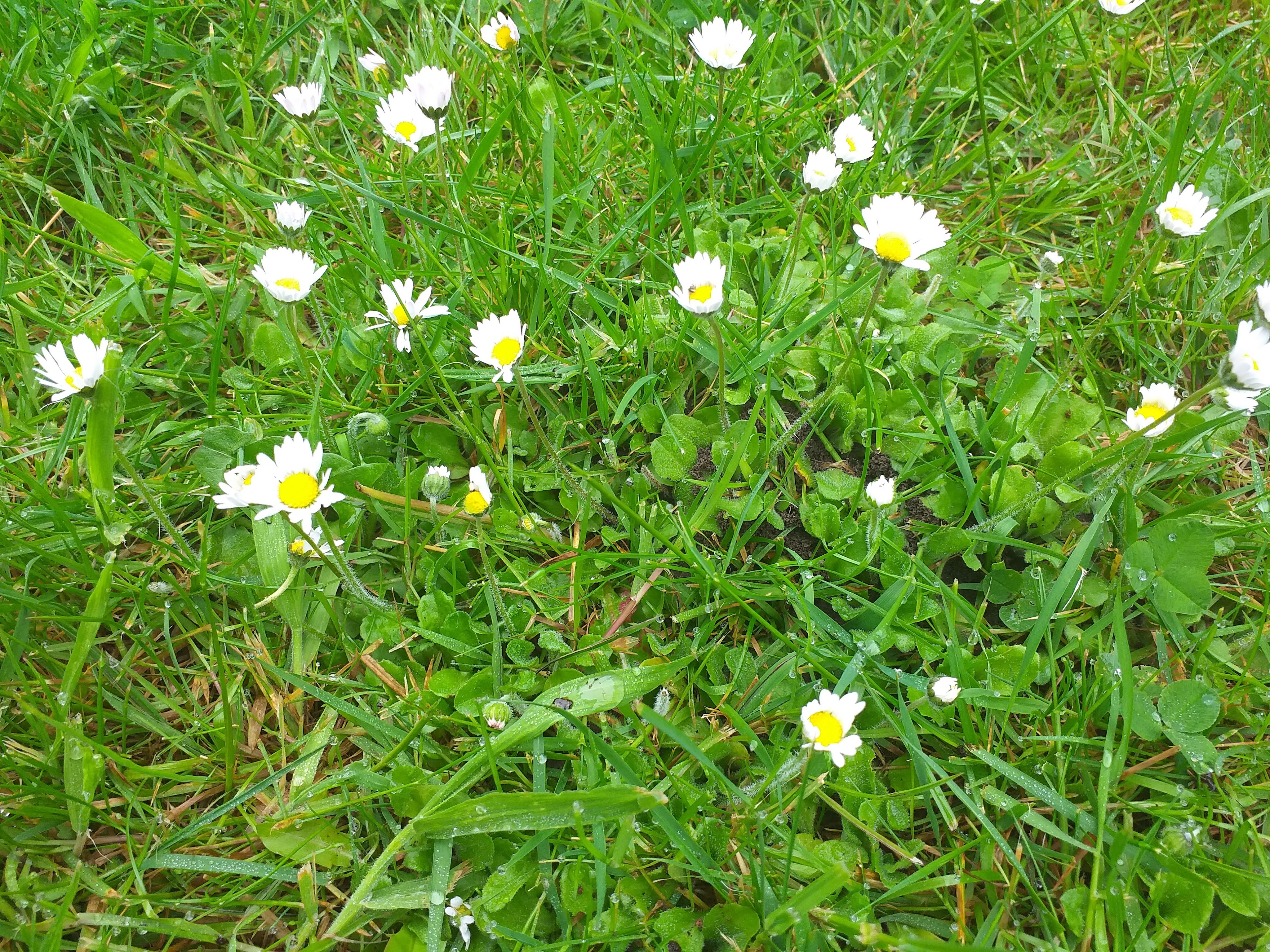 Door de regen en hogere temperaturen van de laatste dagen is het gras hier goed beginnen groeien. Ook diverse bloemen zijn er tussen het gras te zien. Of ik al het gras niet zal maaien weet ik nog niet. Onze katten houden precies niet van lang nat gras.